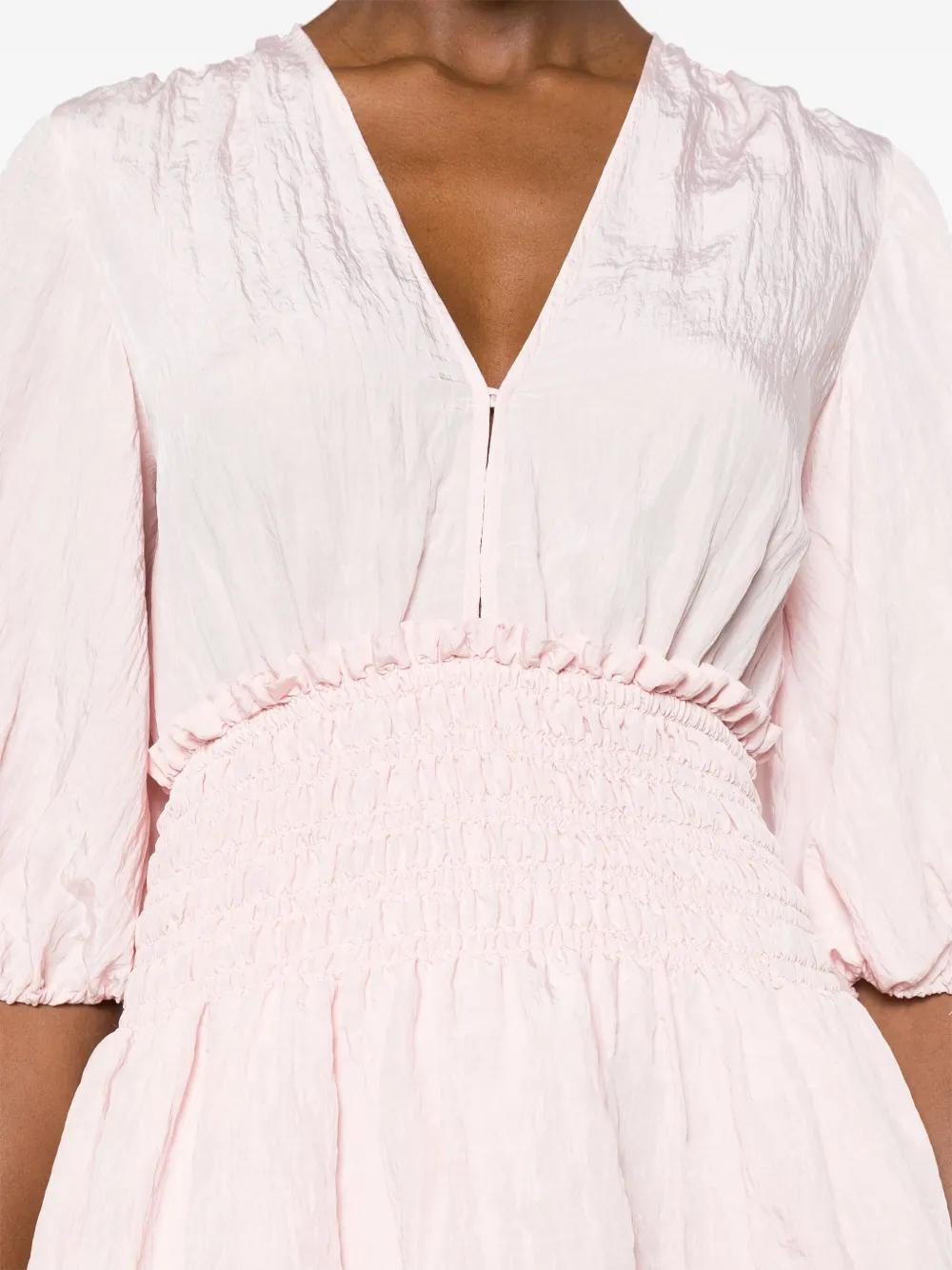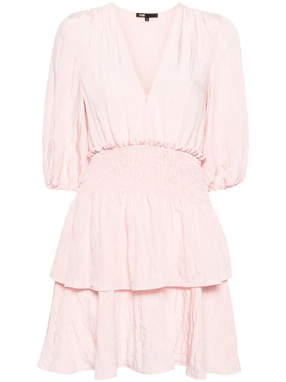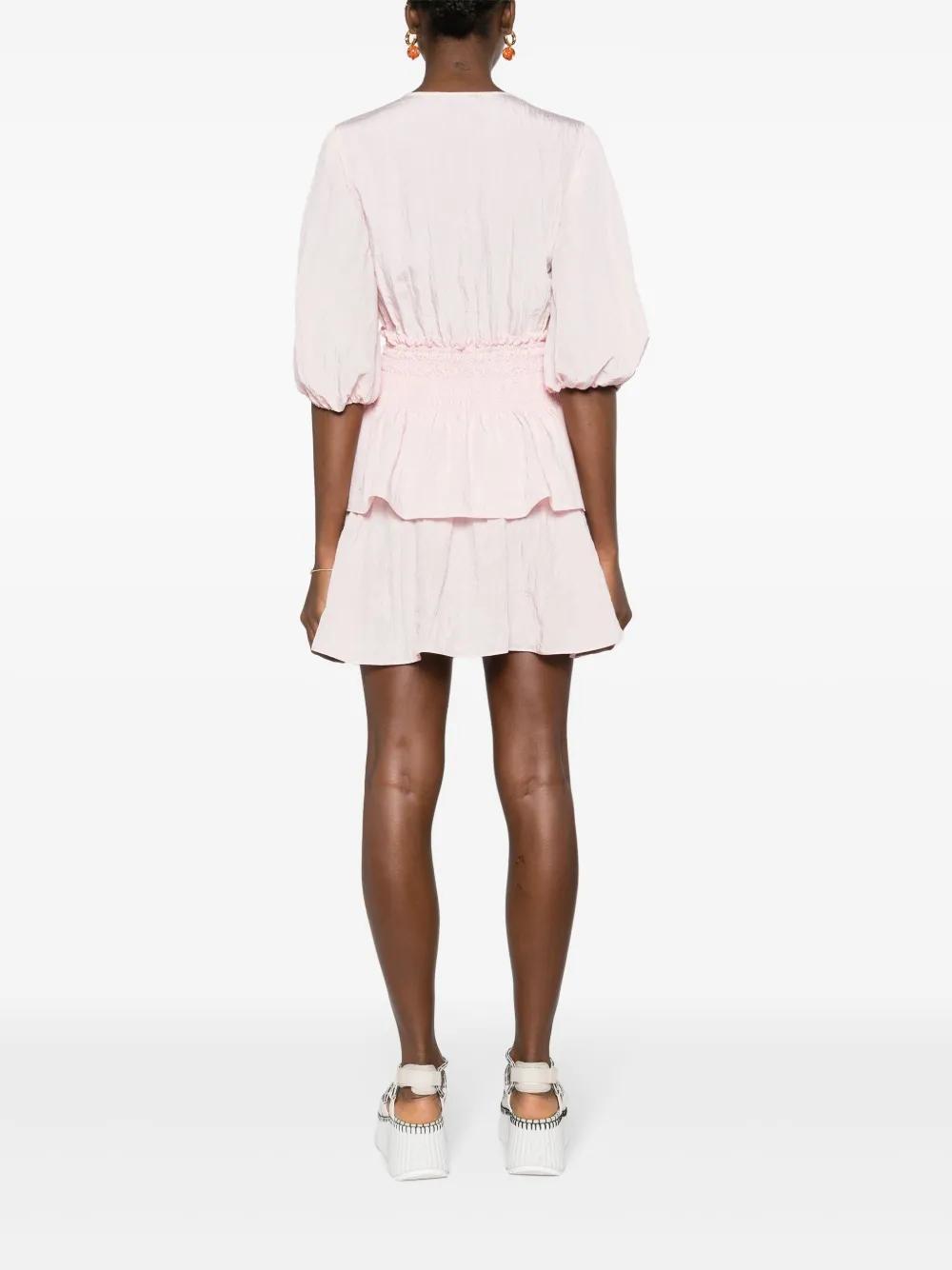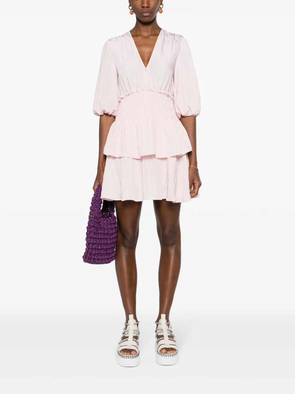 light pink lightweight construction ruffled detailing V-neck half-length sleeves elasticated cuffs shirred waistband tiered skirt straight hem unlined thigh-length