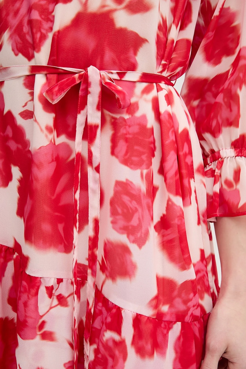 - Rozkloszowany fason. - Model ze stójką. - Ozdobne wiązanie przy dekolcie. - Rękaw trzy czwarte. - Rękawy wykończone wygodnym, elastycznym ściągaczem. - W talii pasek, który modeluje sylwetkę i dodatkowo podkreśla talię. - Model z ozdobną falbaną. - Dodatkowa warstwa materiału w postaci podszewki. - Cienka, nieelastyczna tkanina. - Długość: 120 cm. - Szerokość pod pachami: 56 cm. - Wymiary podane dla rozmiaru: 36.