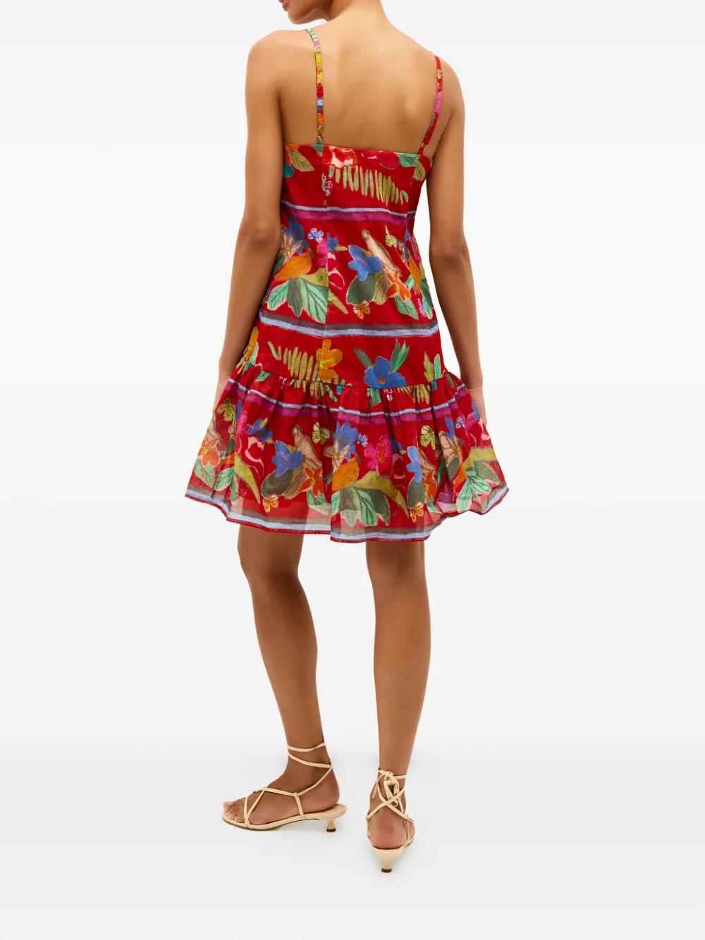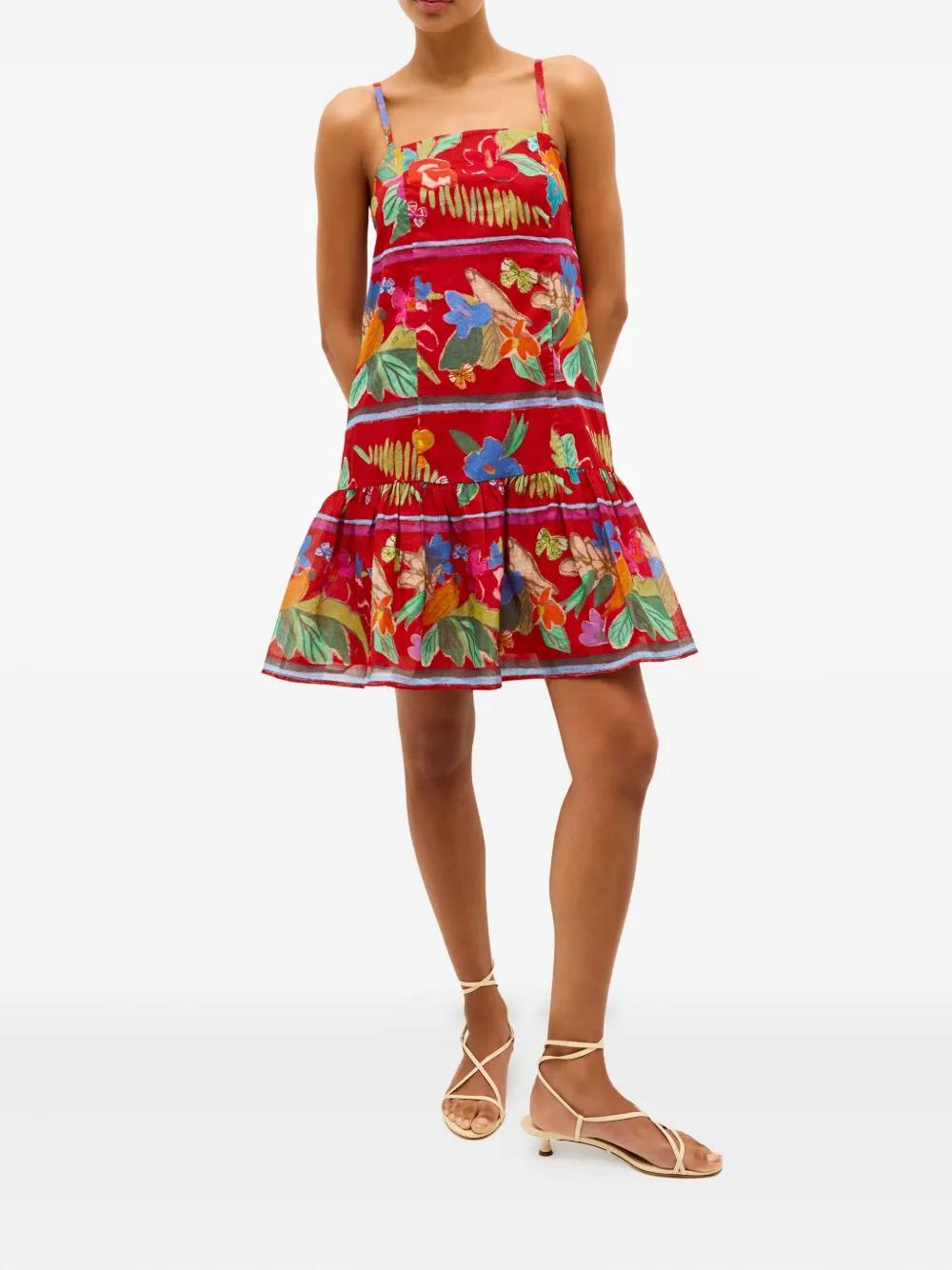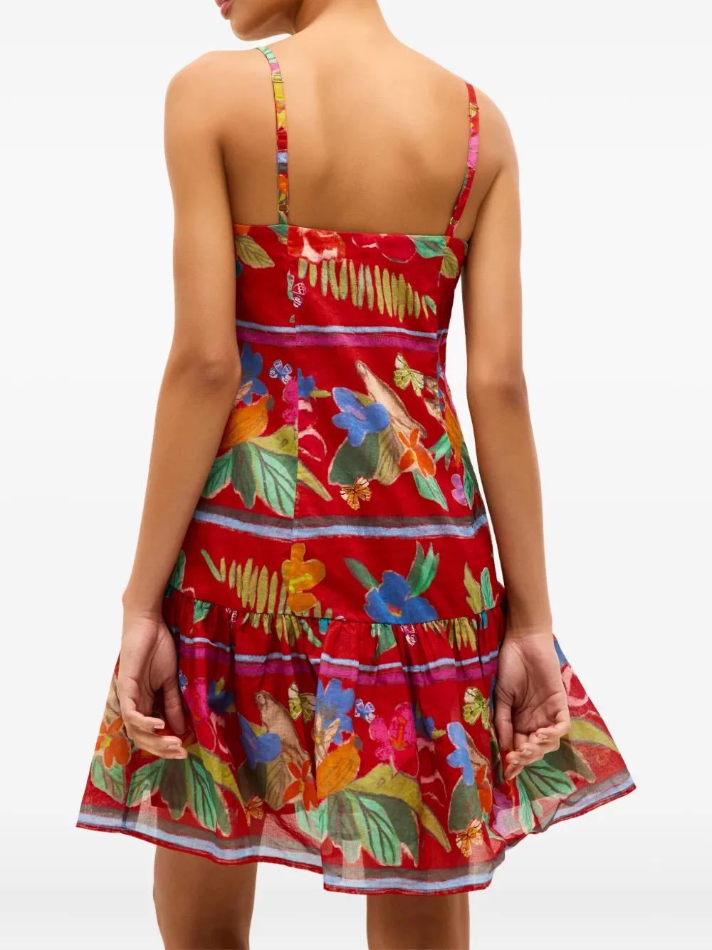 red tropical floral design adjustable spaghetti straps tiered ruffle hem partial lining