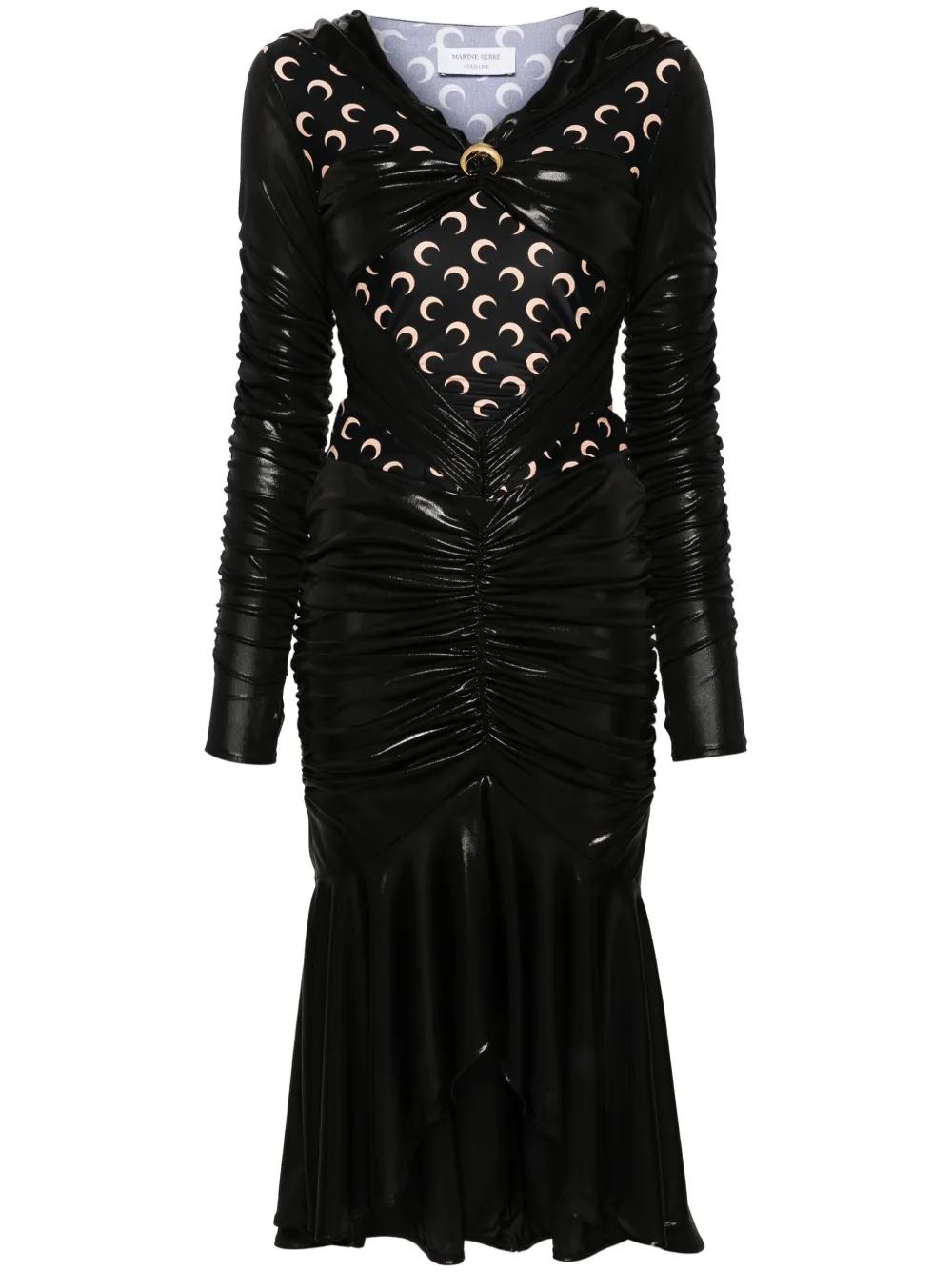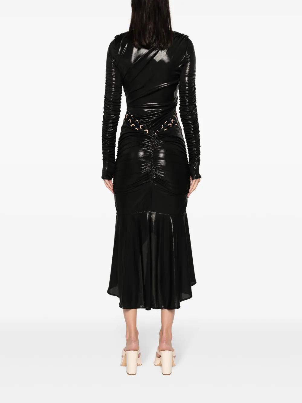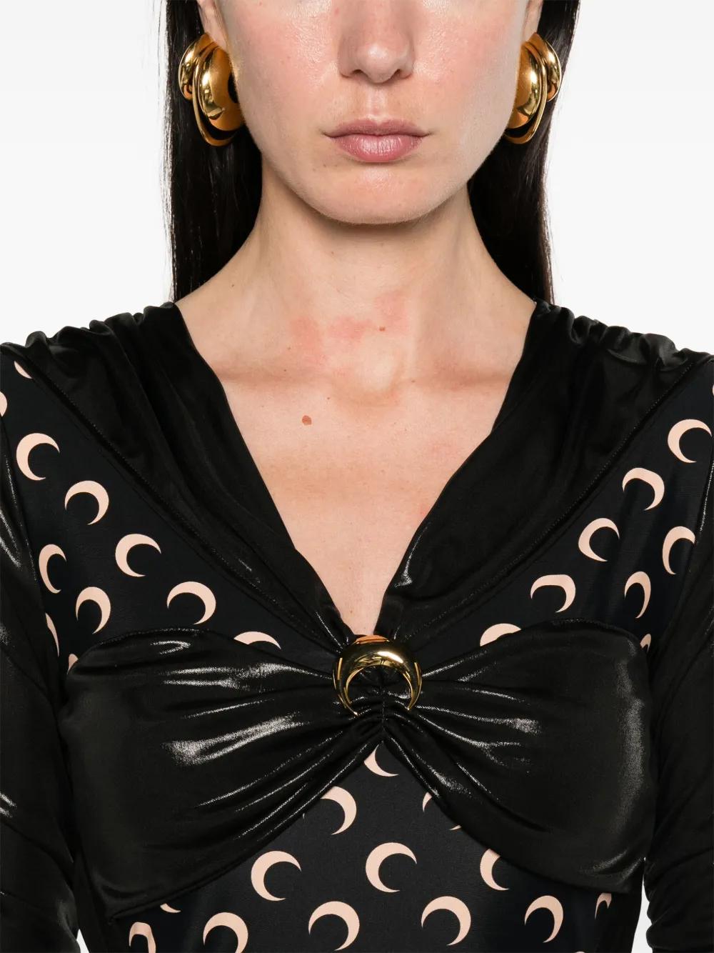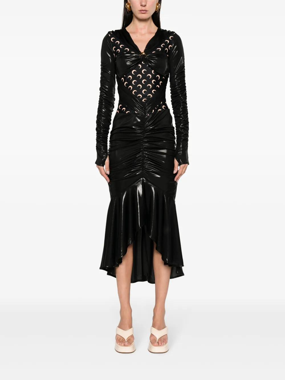 black stretch-jersey high-shine finish crescent moon print gold-tone Moon brooch panelled draped design ruched bodice V-neck long sleeves fitted waistline fishtail design mid-length