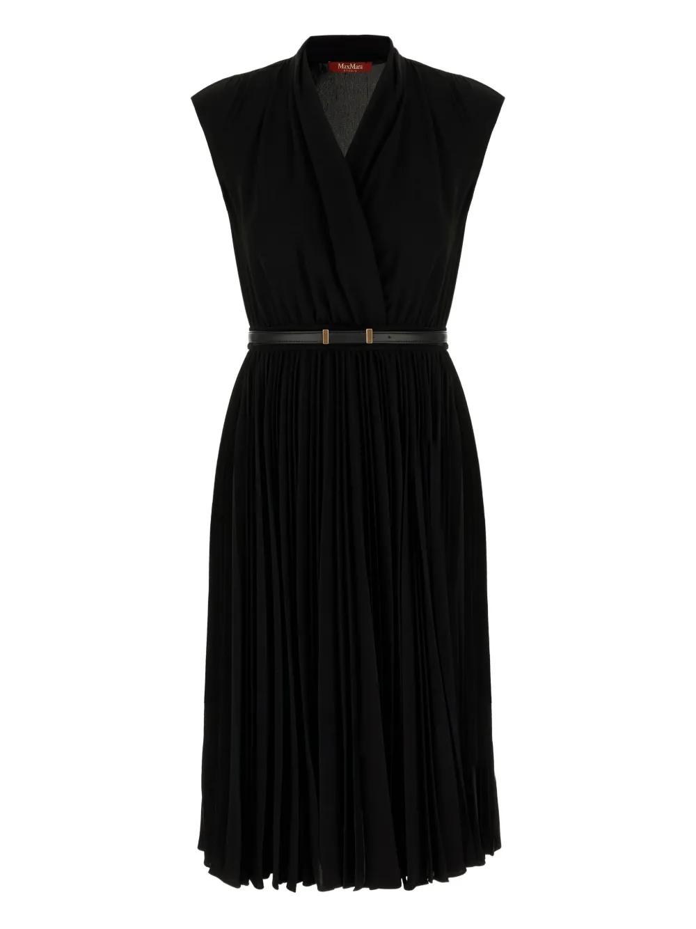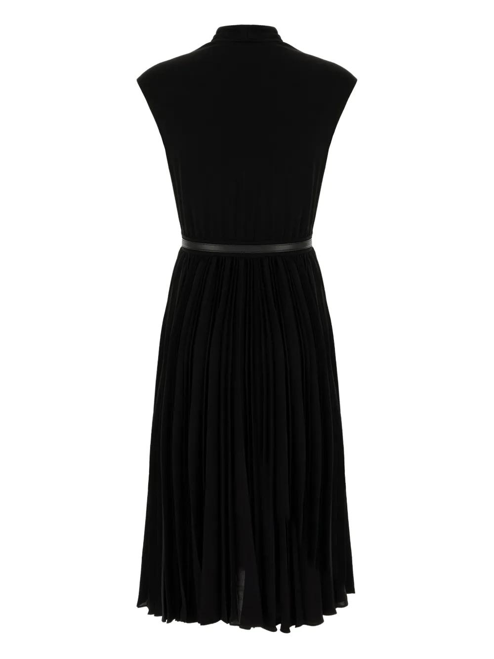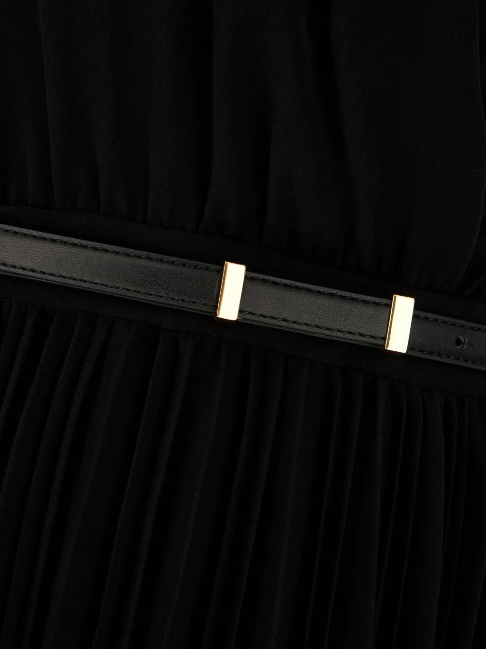 black pleated skirt sleeveless V-neck gold-tone buckle