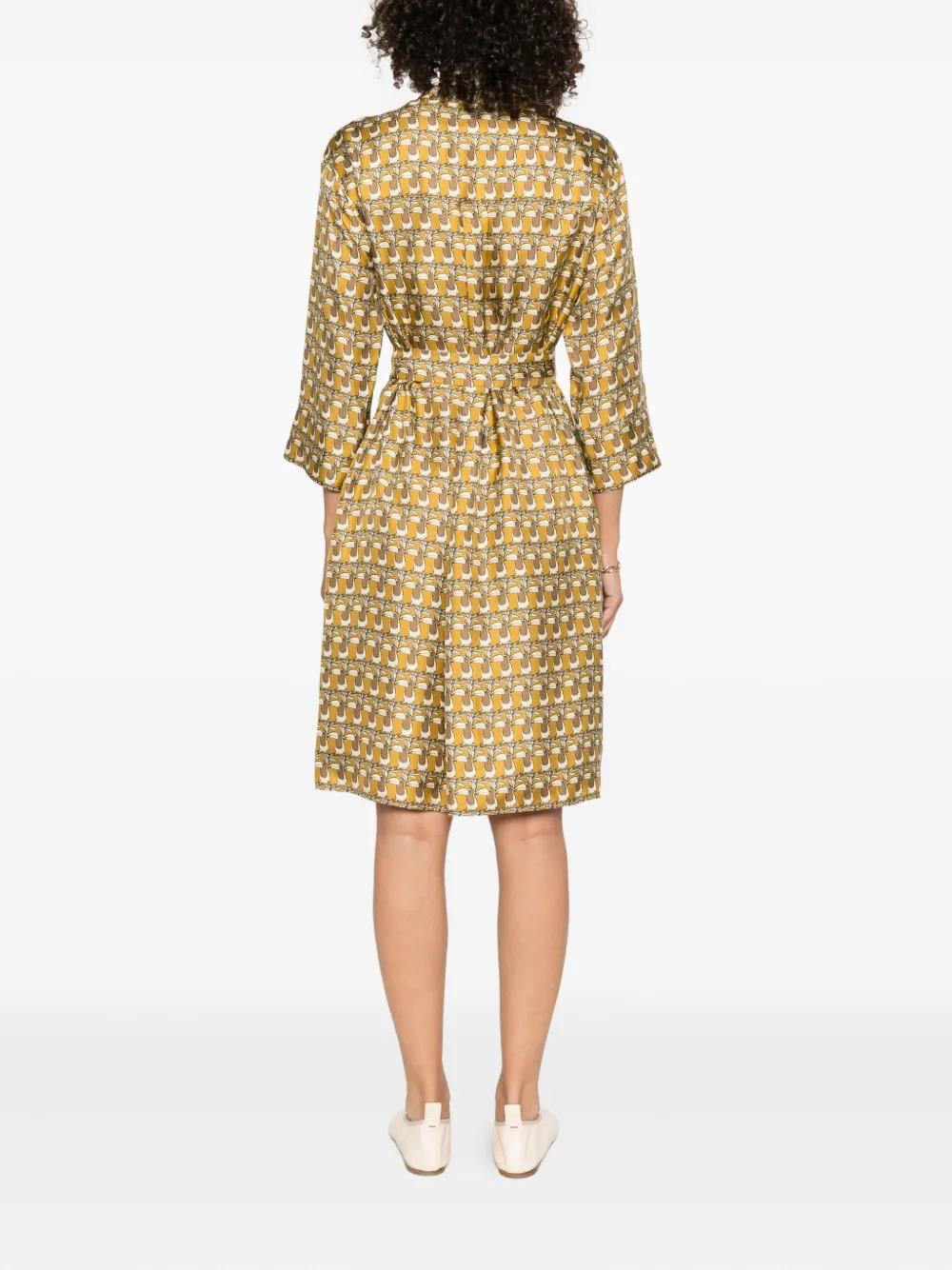 beige silk toucan print three-quarter sleeves belted waist button fastening