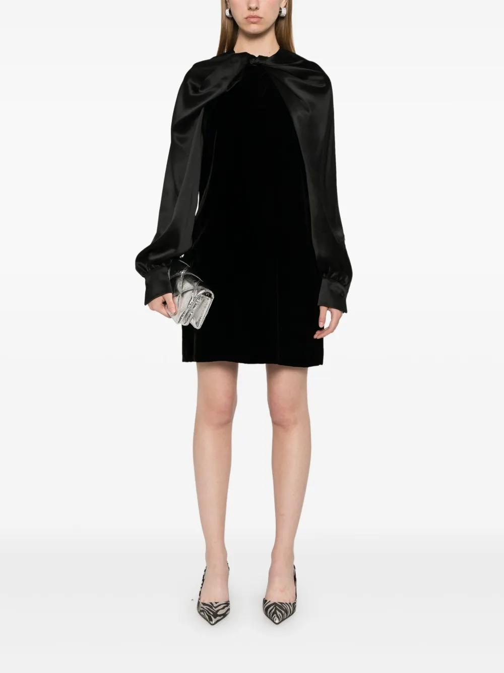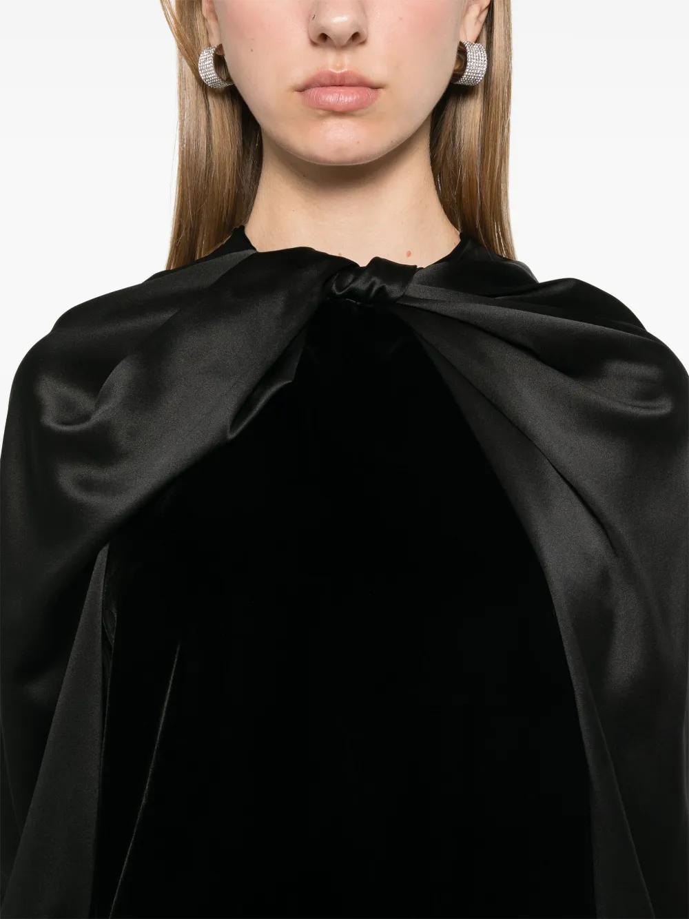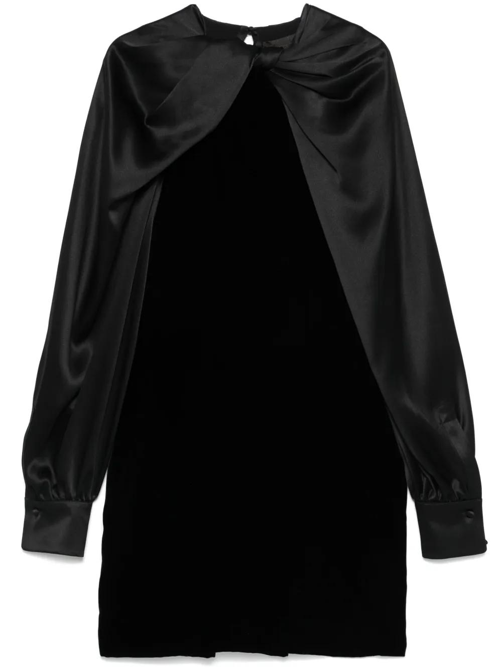 black silk satin finish/velvet finish single rear button fastening rear zip fastening round neck knot detailing long sleeves buttoned cuffs pleat detailing open back full lining straight hem