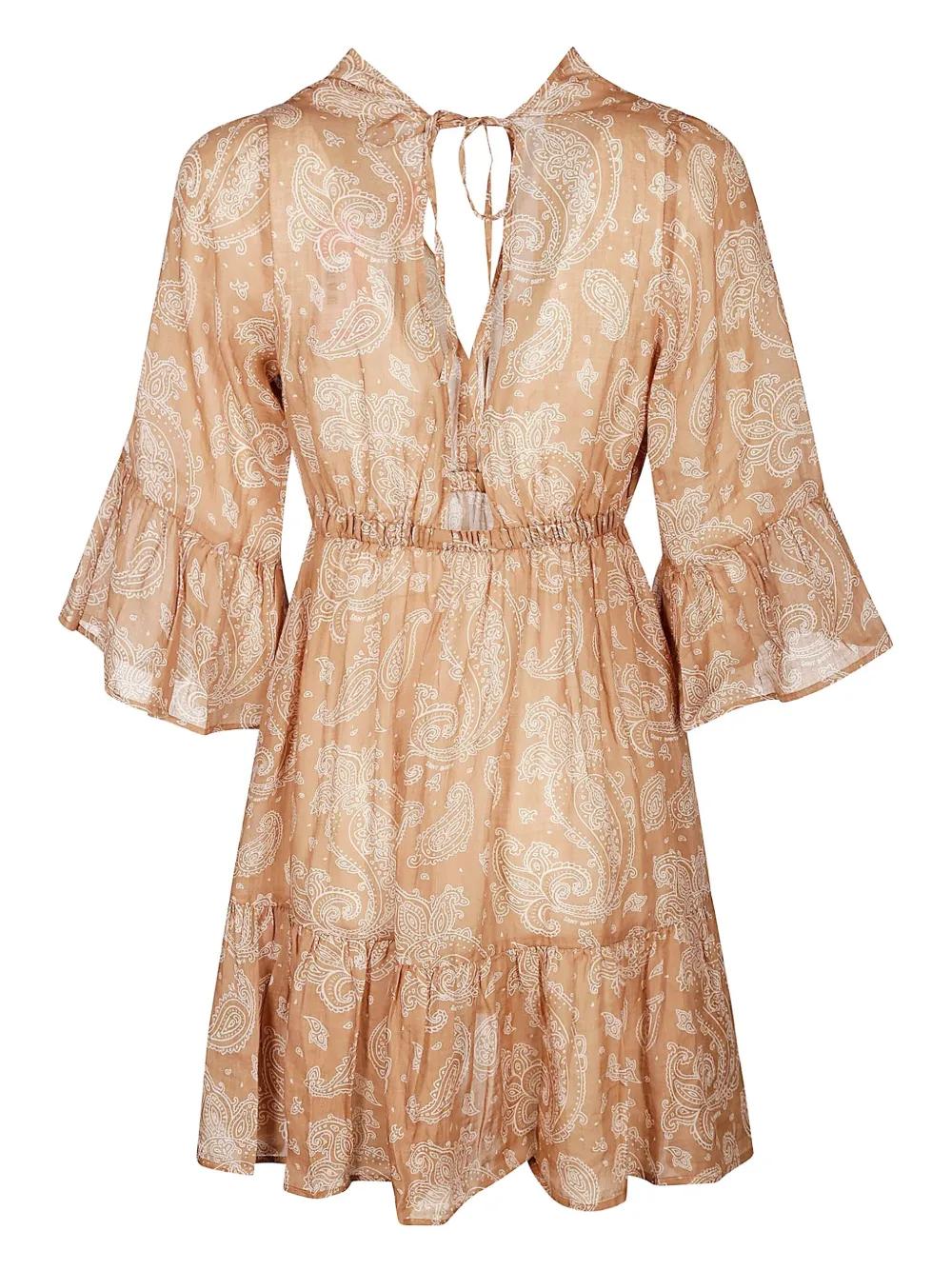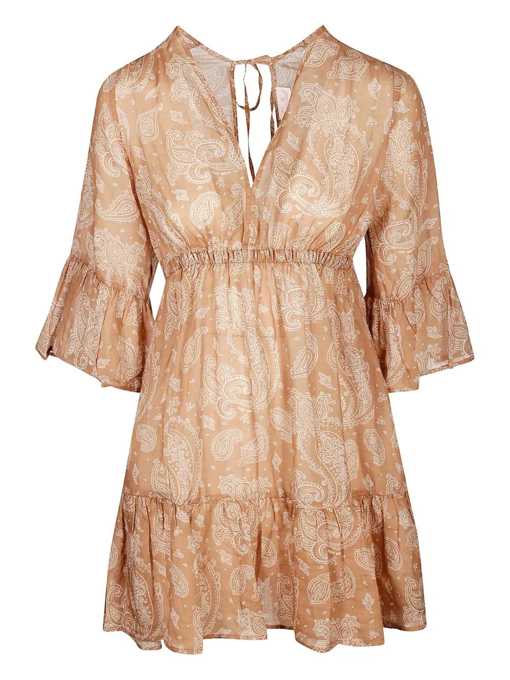 light brown paisley print V-neck three-quarter bell sleeves tiered skirt rear drawstring fastening