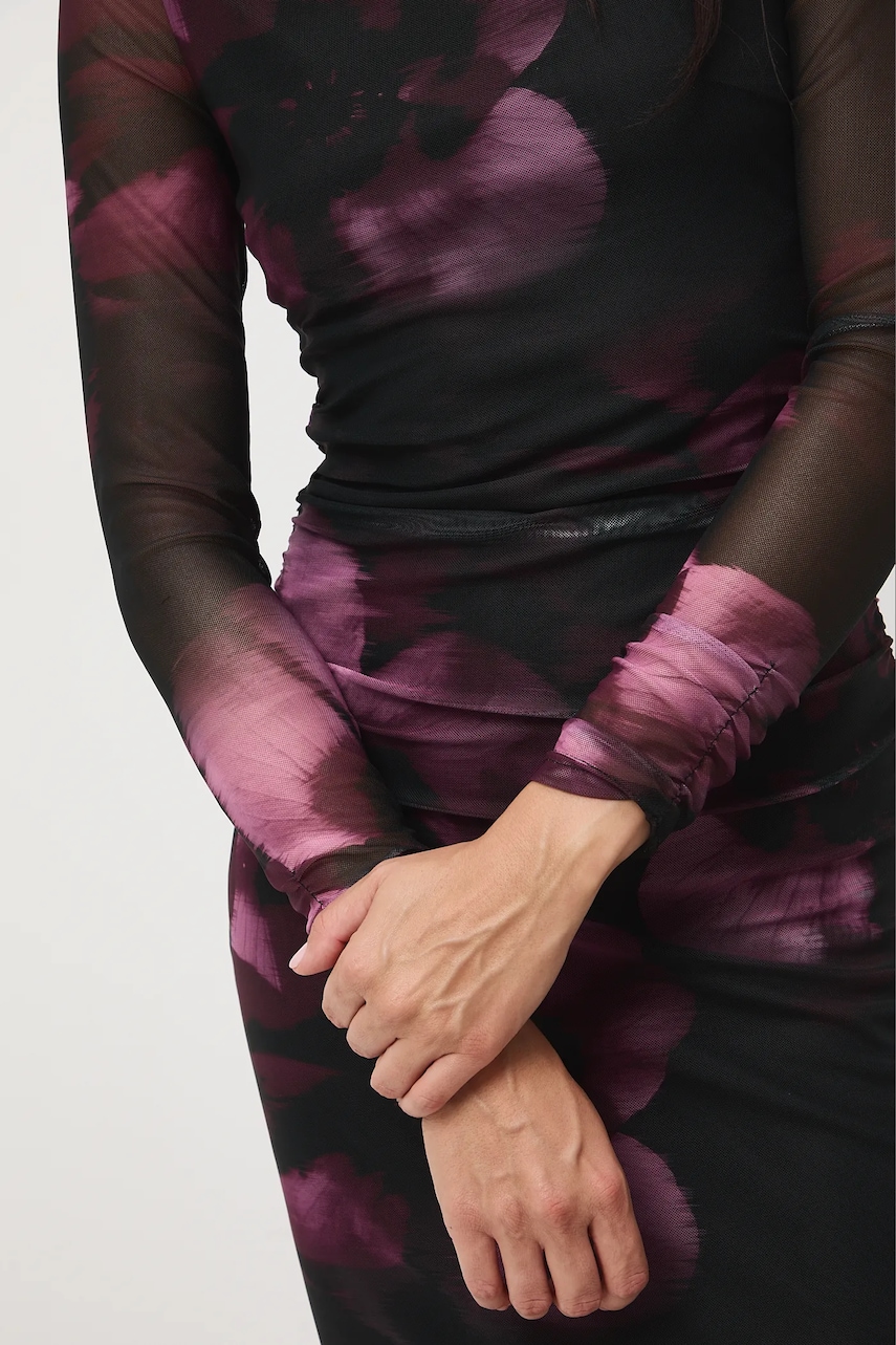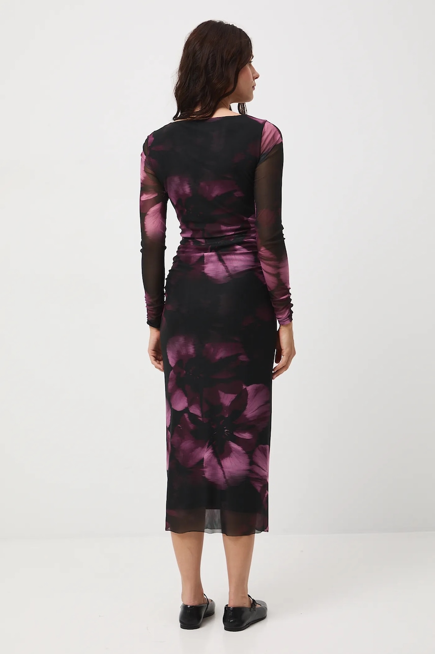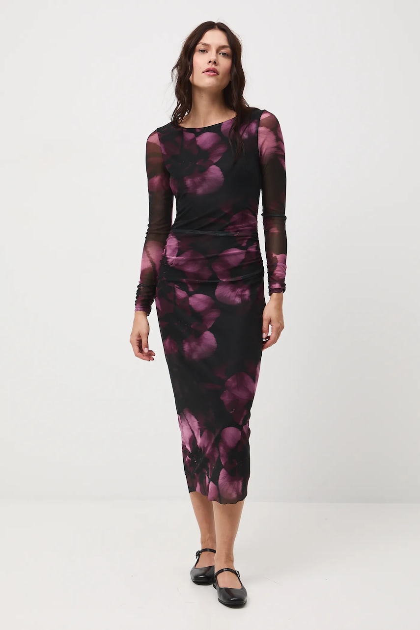 - Dopasowany fason. - Długie, dopasowane rękawy. - Rękawy z ozdobnymi marszczeniami. - Okrągły dekolt. - Model wykonany z transparentnej siateczki. - Ozdobne marszczenia. - Dodatkowa warstwa materiału w postaci podszewki. - Wzór z motywem kwiatowym. - Model o długości midi. - Długość rękawa: 61 cm. - Szerokość w biuście: 40,5 cm. - Szerokość w talii: 32 cm. - Długość: 126 cm. - Wymiary podane dla rozmiaru: S.