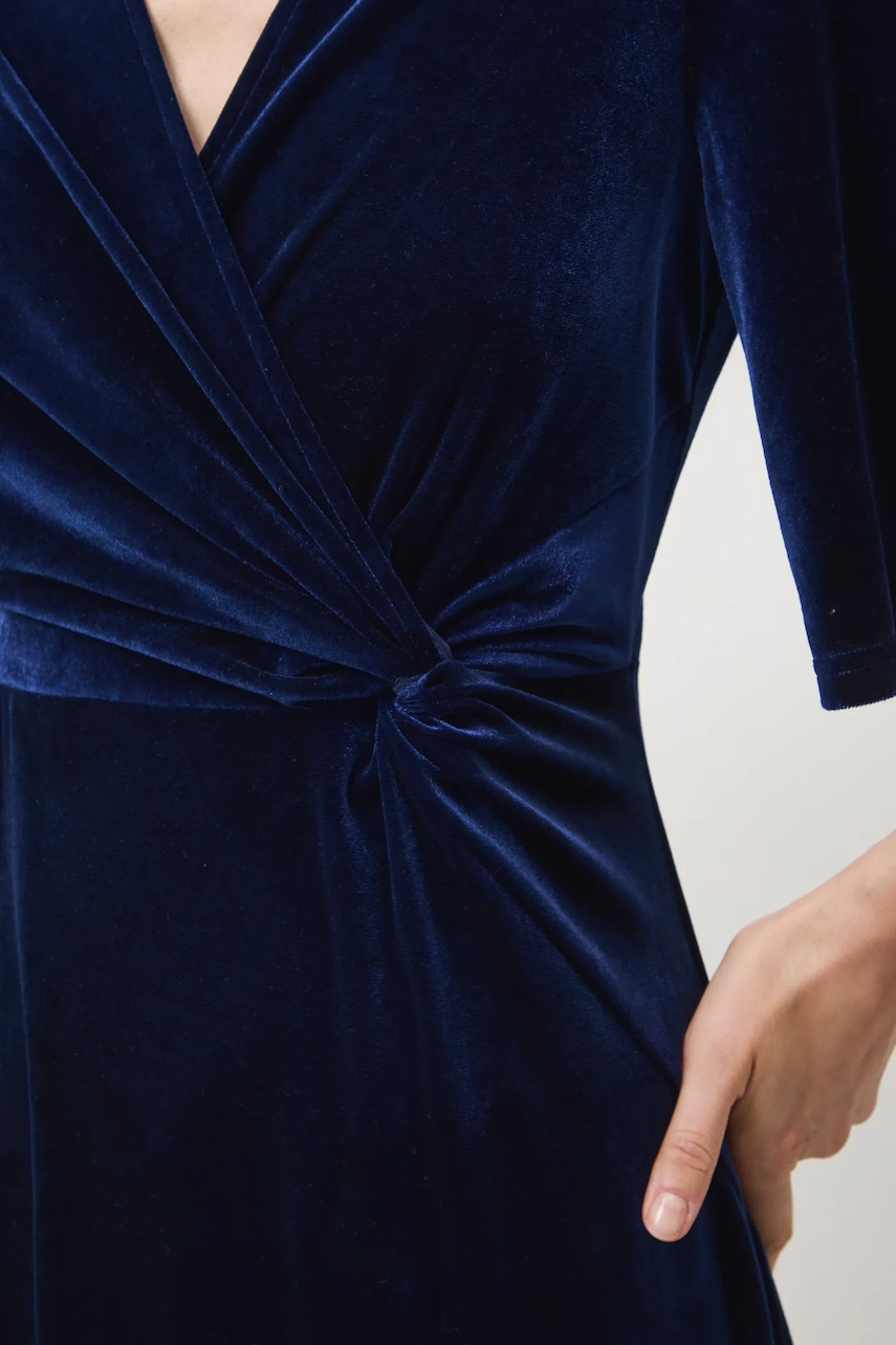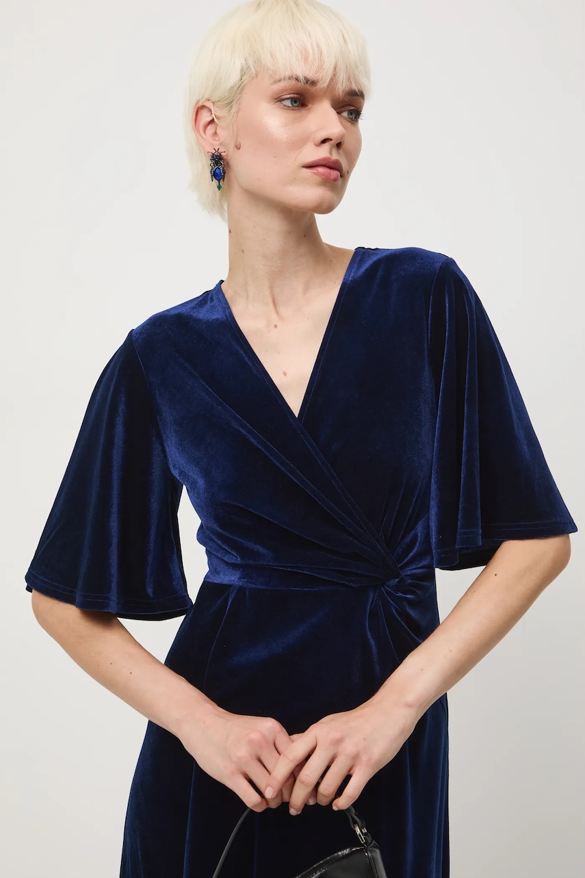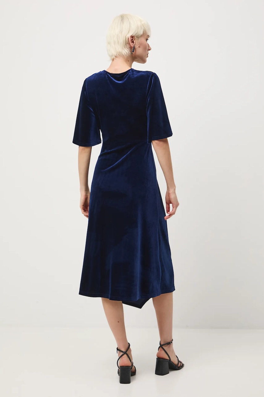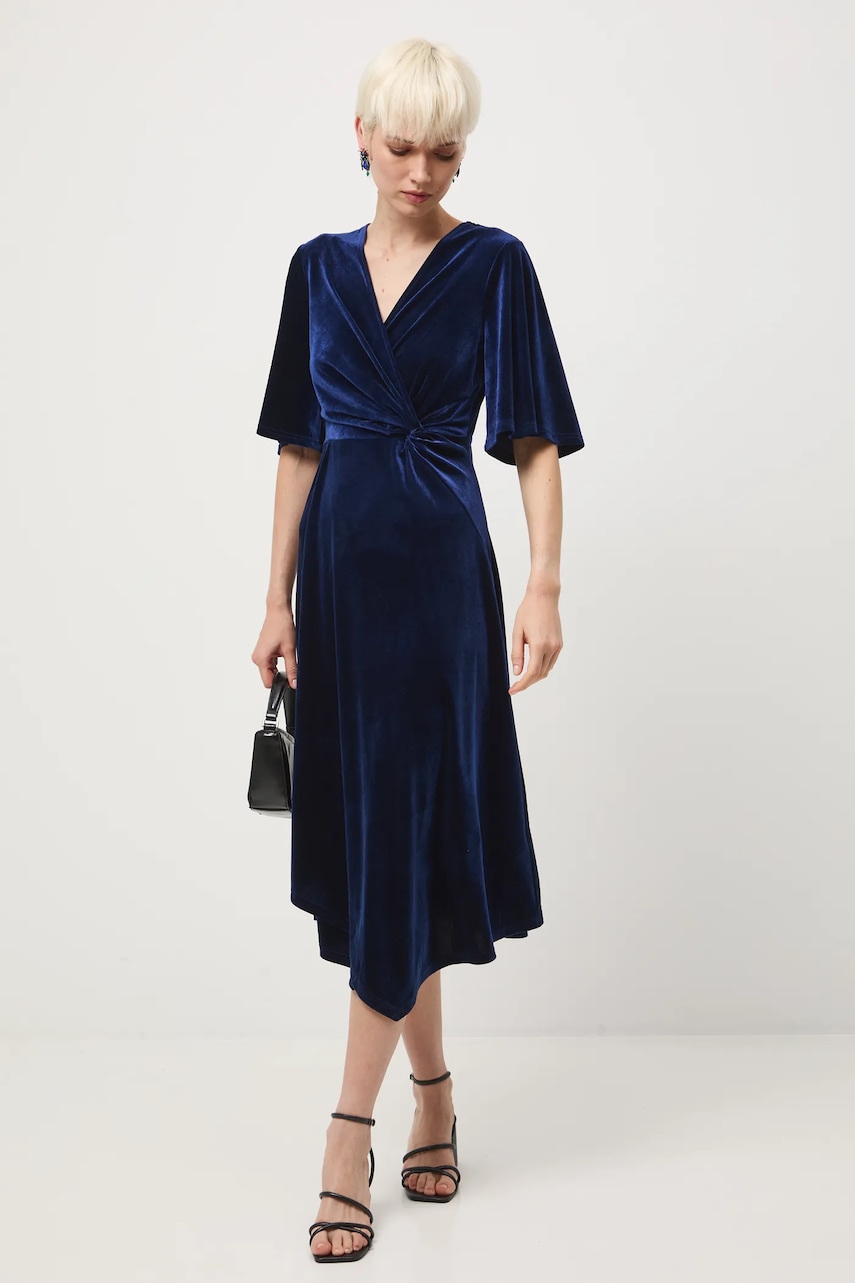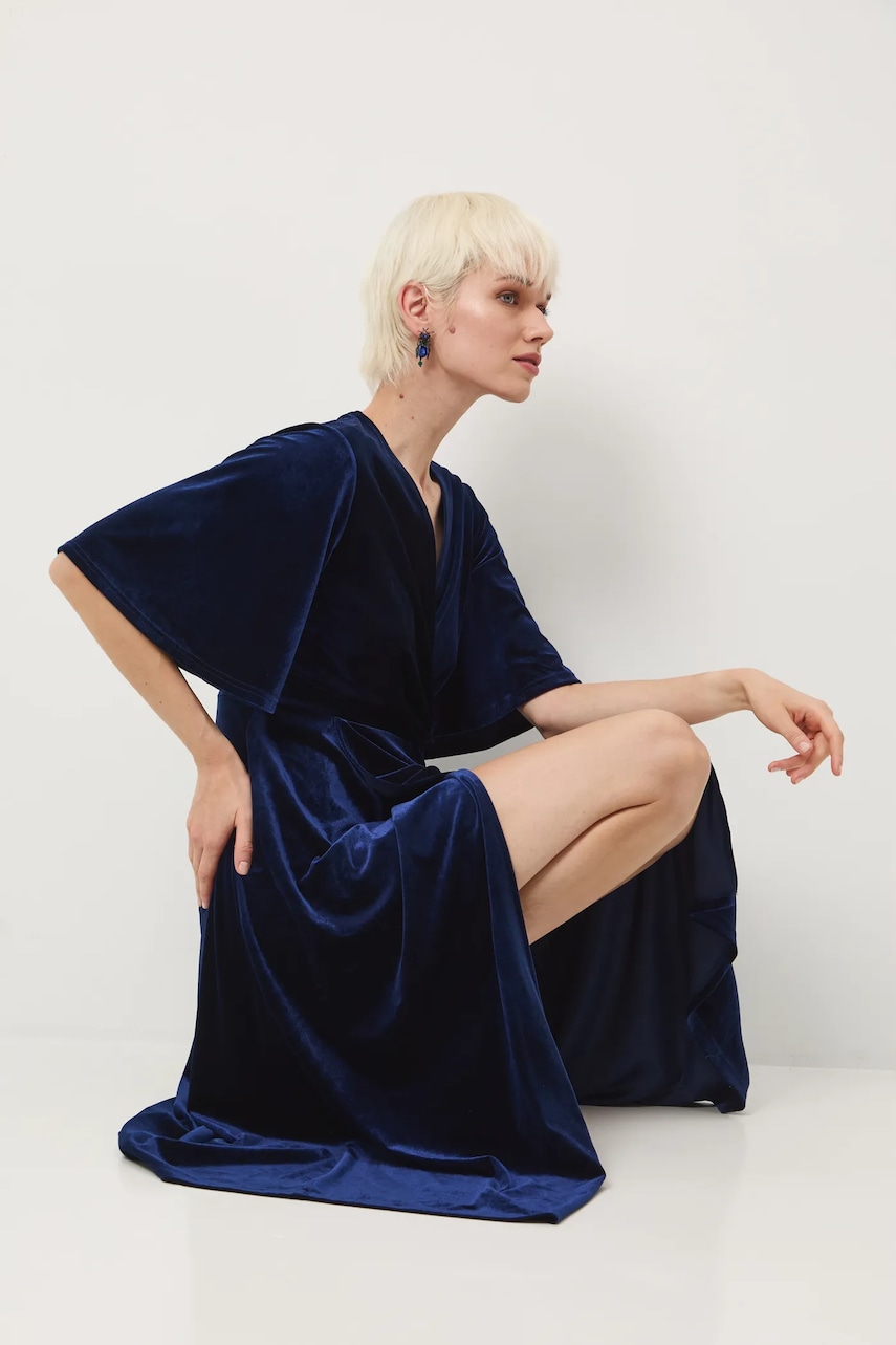 - Rozkloszowany fason. - Krótkie, szerokie rękawy. - Spiczasty, kopertowy dekolt. - Ozdobne marszczenia. - Ozdobne wiązanie. - Model wykonany z welurowego materiału. - Model o długości midi. - Szerokość w biuście: 42 cm. - Szerokość w talii: 34 cm. - Długość: 132 cm. - Wymiary podane dla rozmiaru: S.