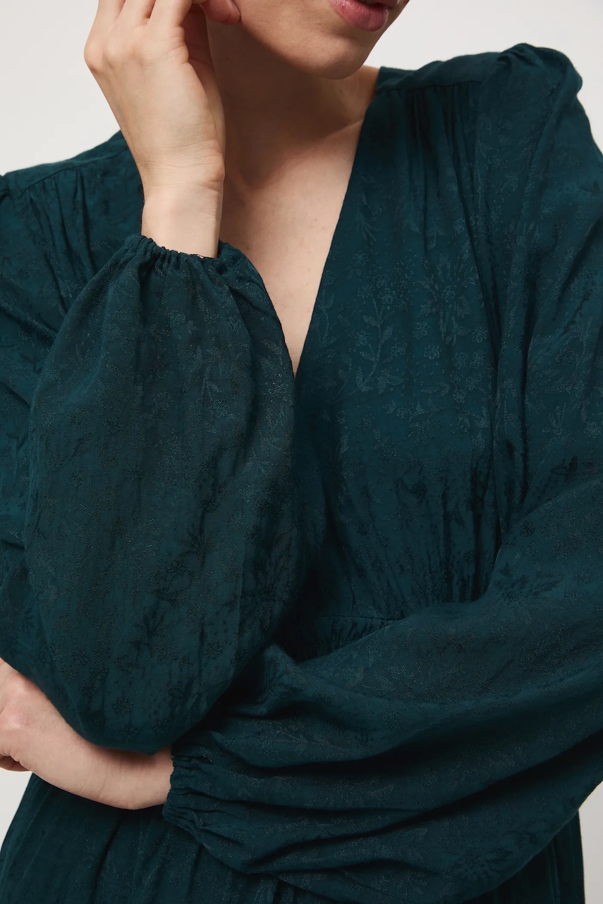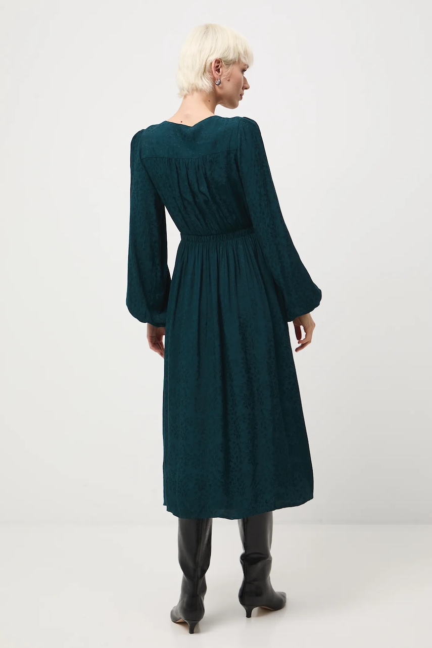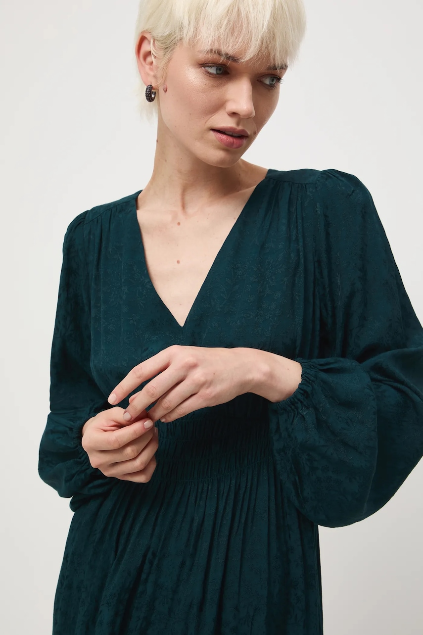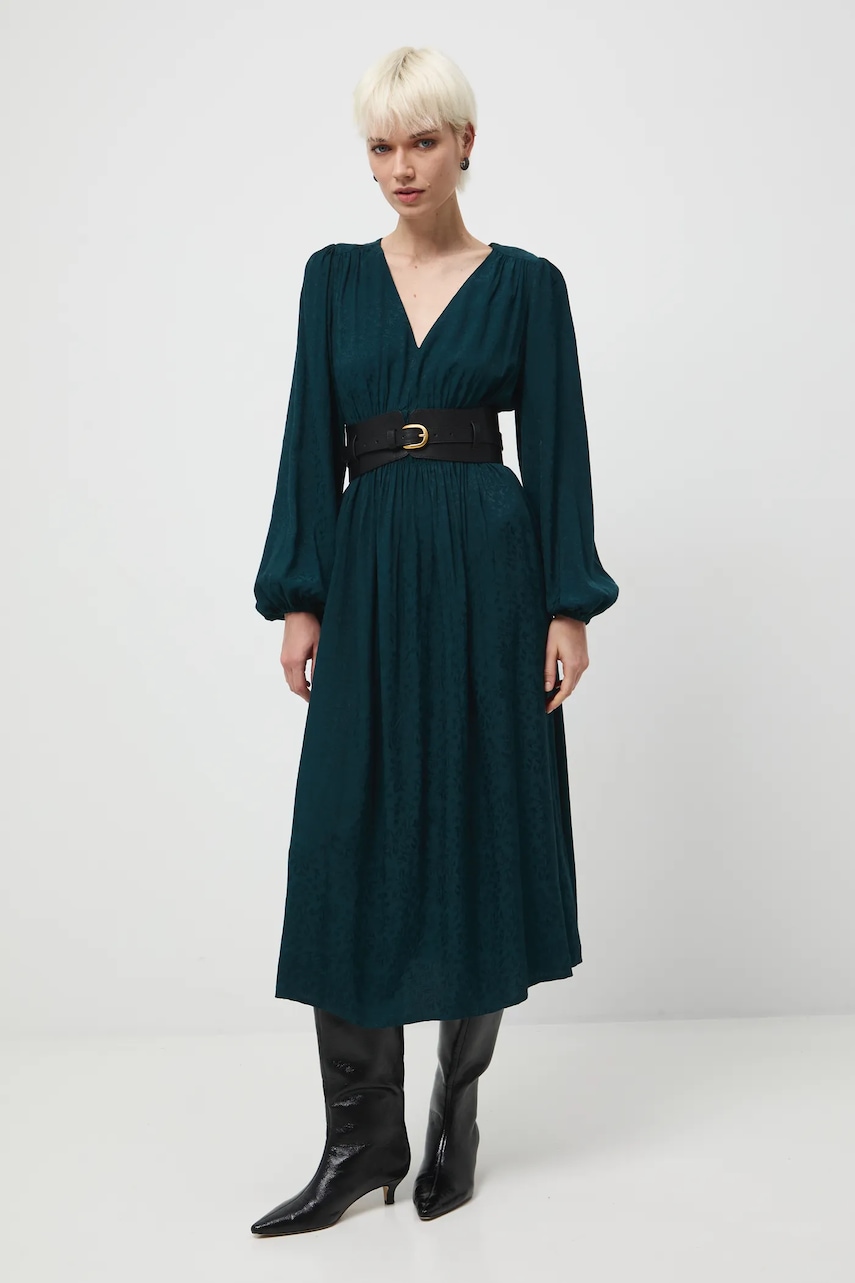 - Rozkloszowany fason. - Długie rękawy. - Rękawy wykończone elastyczną gumką. - Spiczasty dekolt. - W pasie szeroka, elastyczna listwa. - Ozdobne marszczenia. - Wzorzysta tkanina. - Model o długości midi. - Szerokość w talii (przed rozciągnięciem): 32 cm. - Szerokość w talii (po rozciągnięciu): 51 cm. - Szerokość w biuście: 54 cm. - Długość: 127 cm. - Wymiary podane dla rozmiaru: S. - Pasek widoczny na zdjęciu nie jest dołączony do produktu.