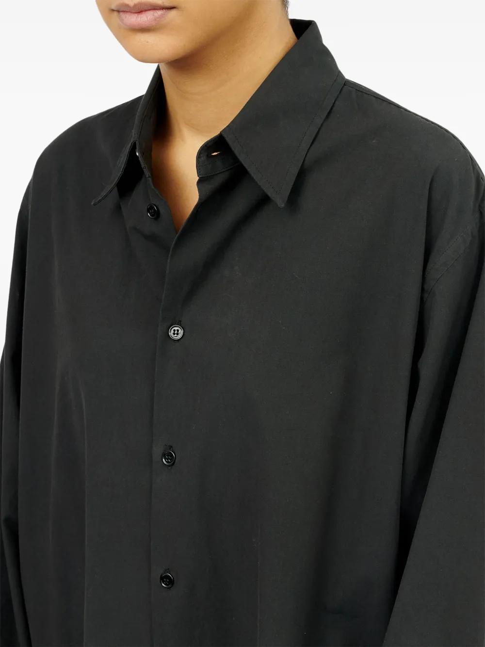 black cotton poplin texture front button fastening classic collar long sleeves buttoned cuffs graphic print to the front signature single-stitch logo asymmetric hem