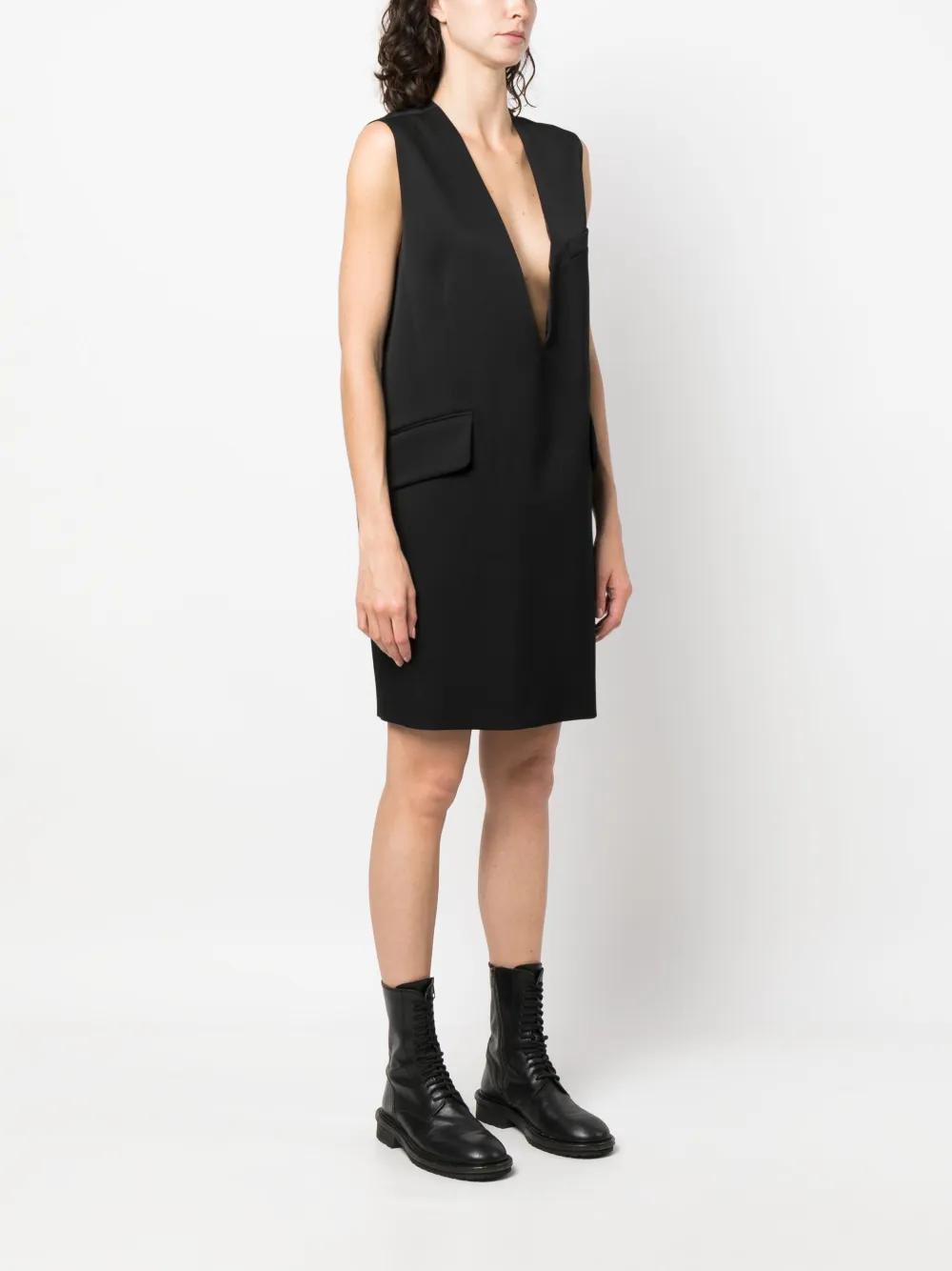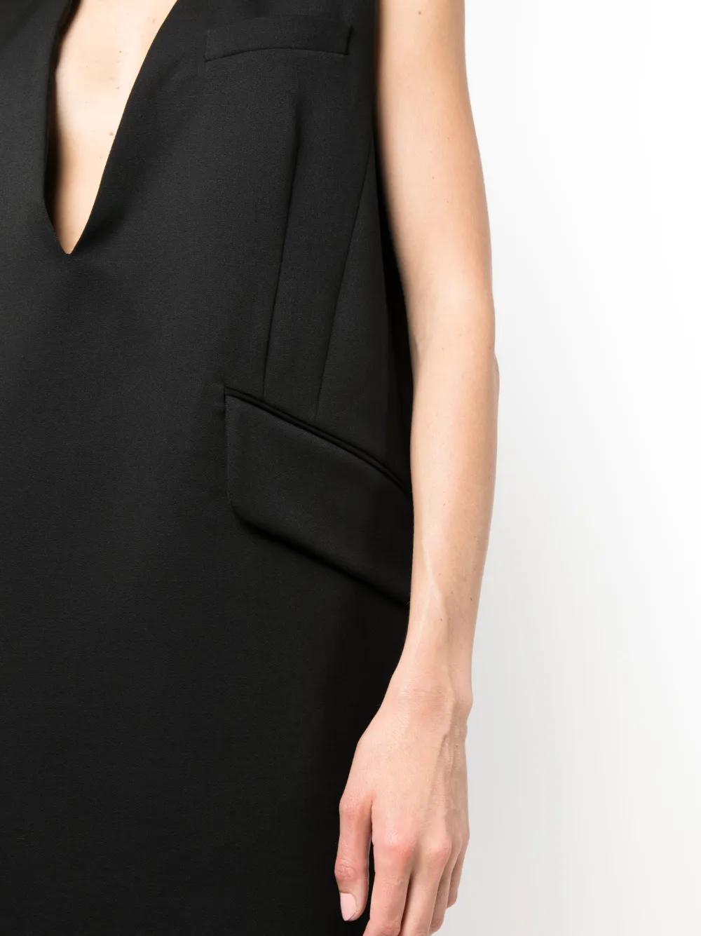 black pleat detailing plunging V-neck sleeveless chest welt pocket two front flap pockets straight hem above-knee length