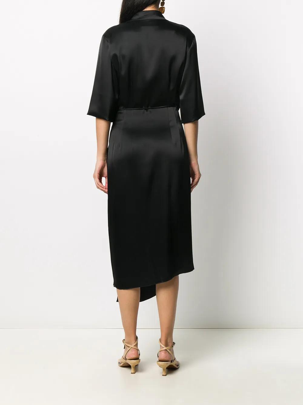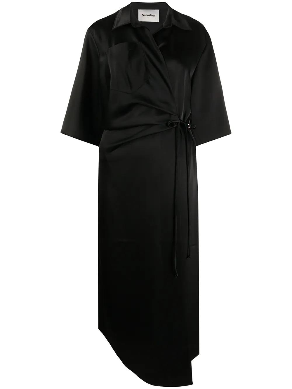 black wingtip collar concealed front fastening side tie fastening short sleeves chest patch pocket asymmetric hem mid-length