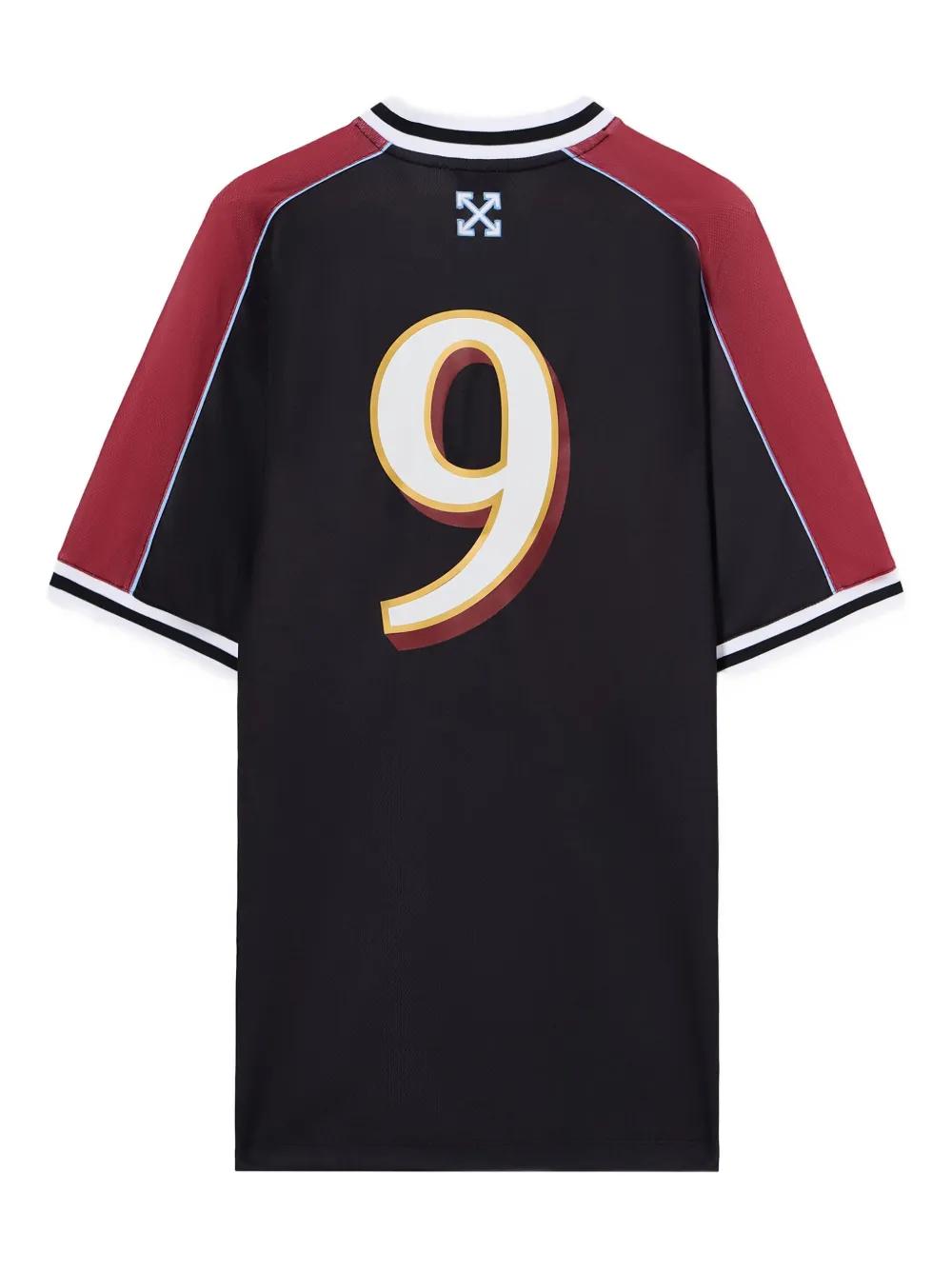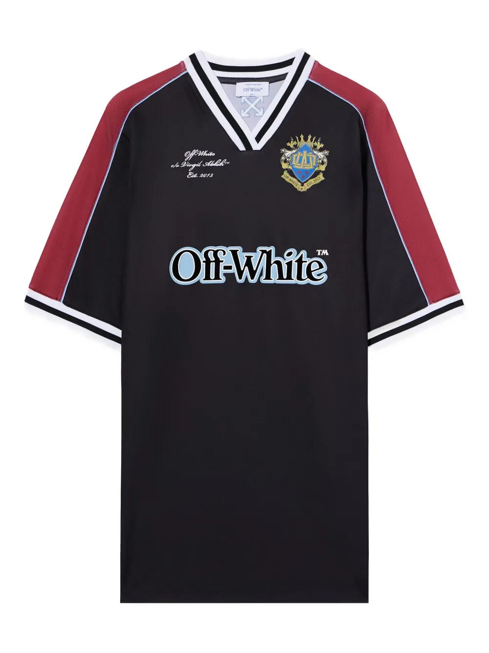 black ribbed v-neck short sleeves contrast stripe accents embroidered logo motifs numeric print