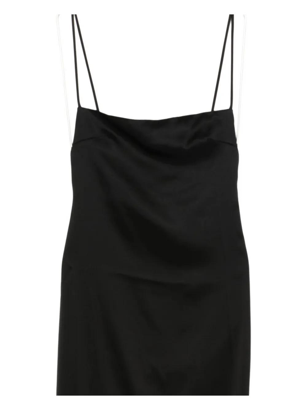 black lambskin smooth grain tonal stitching dart detailing at the chest halterneck square neck concealed rear zip fastening adjustable spaghetti straps sleeveless rear slit straight hem