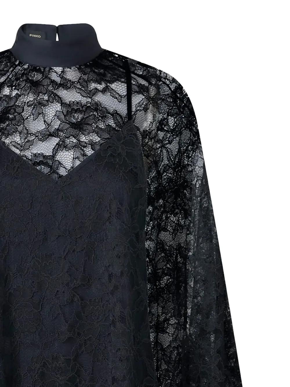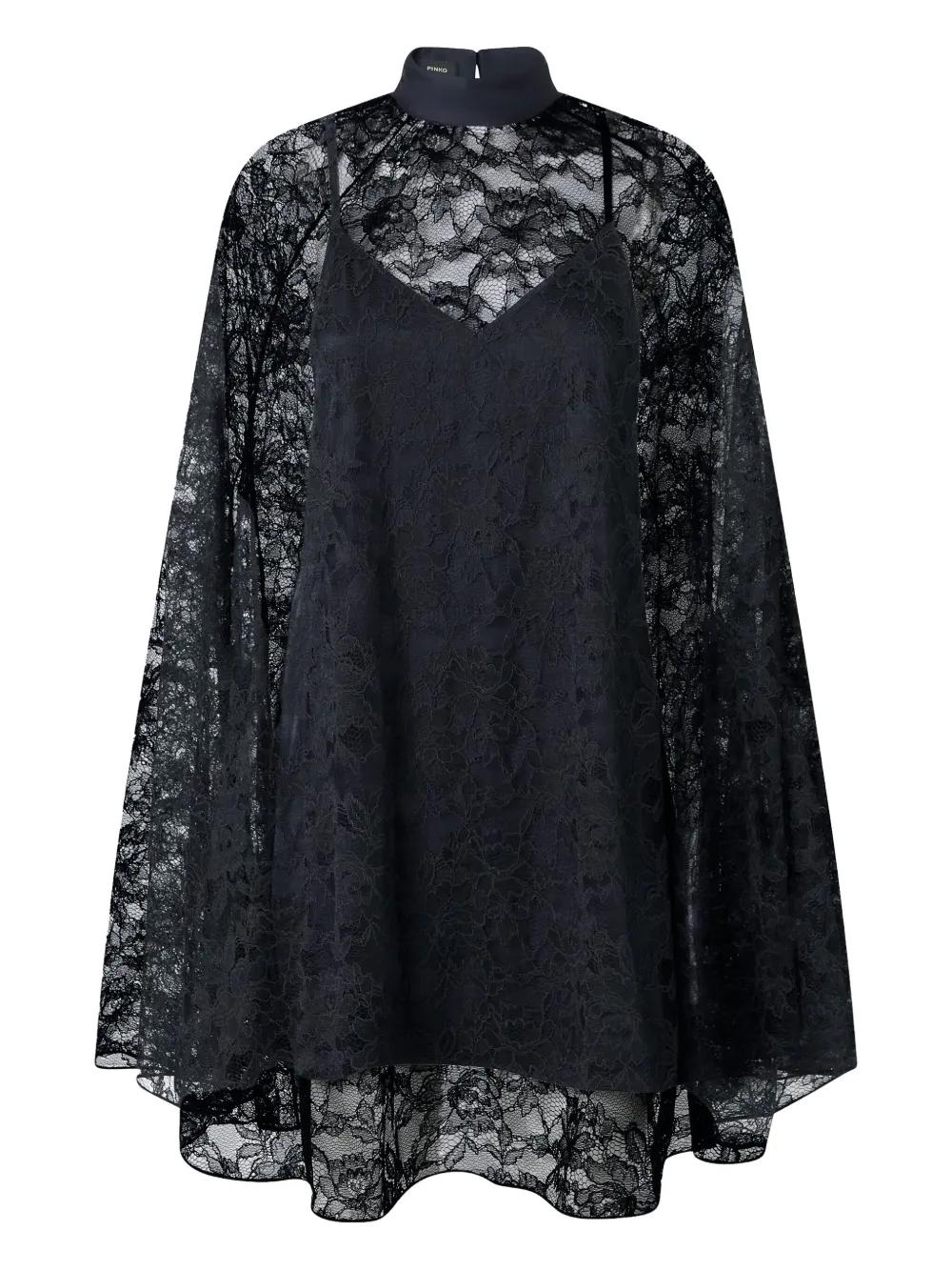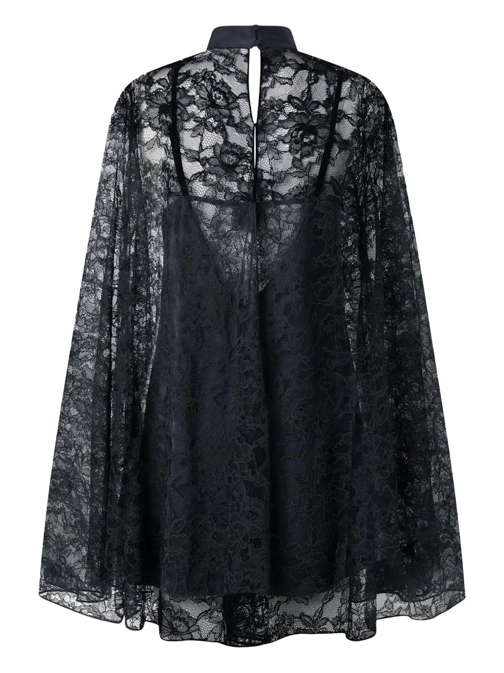 black all-over floral lace embroidery high neck long cape sleeves back button closure