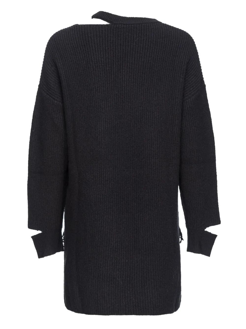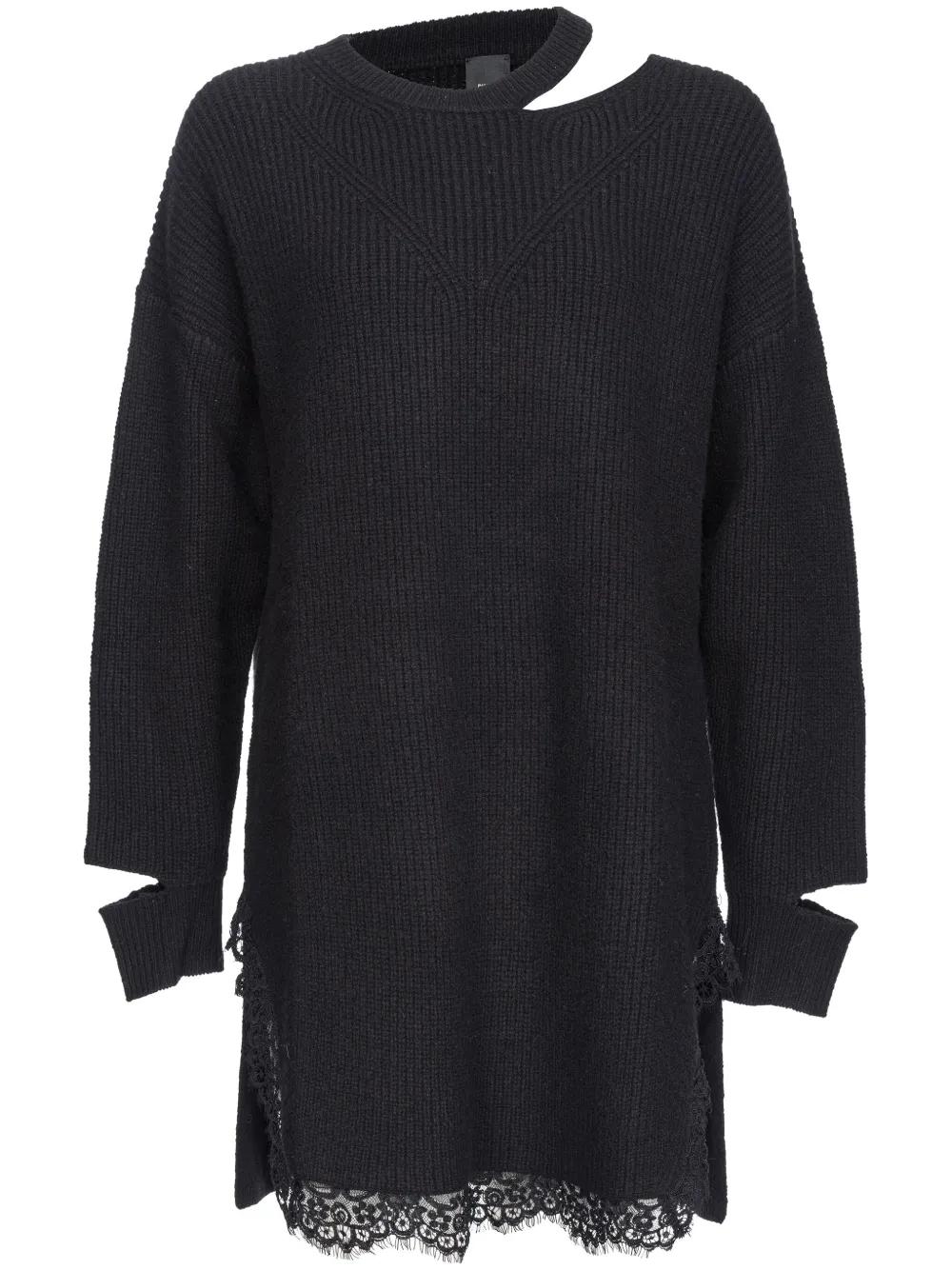 black cashmere blend knitted construction cut-out detailing lace trim round neck long sleeves straight hem