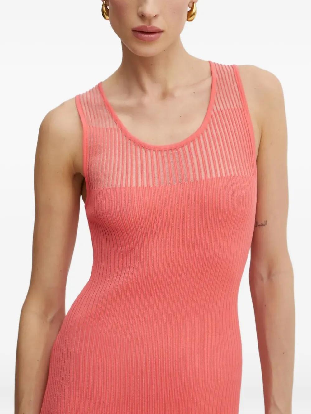 coral ribbed knit pleated hem sleeveless scoop neck sheer yoke
