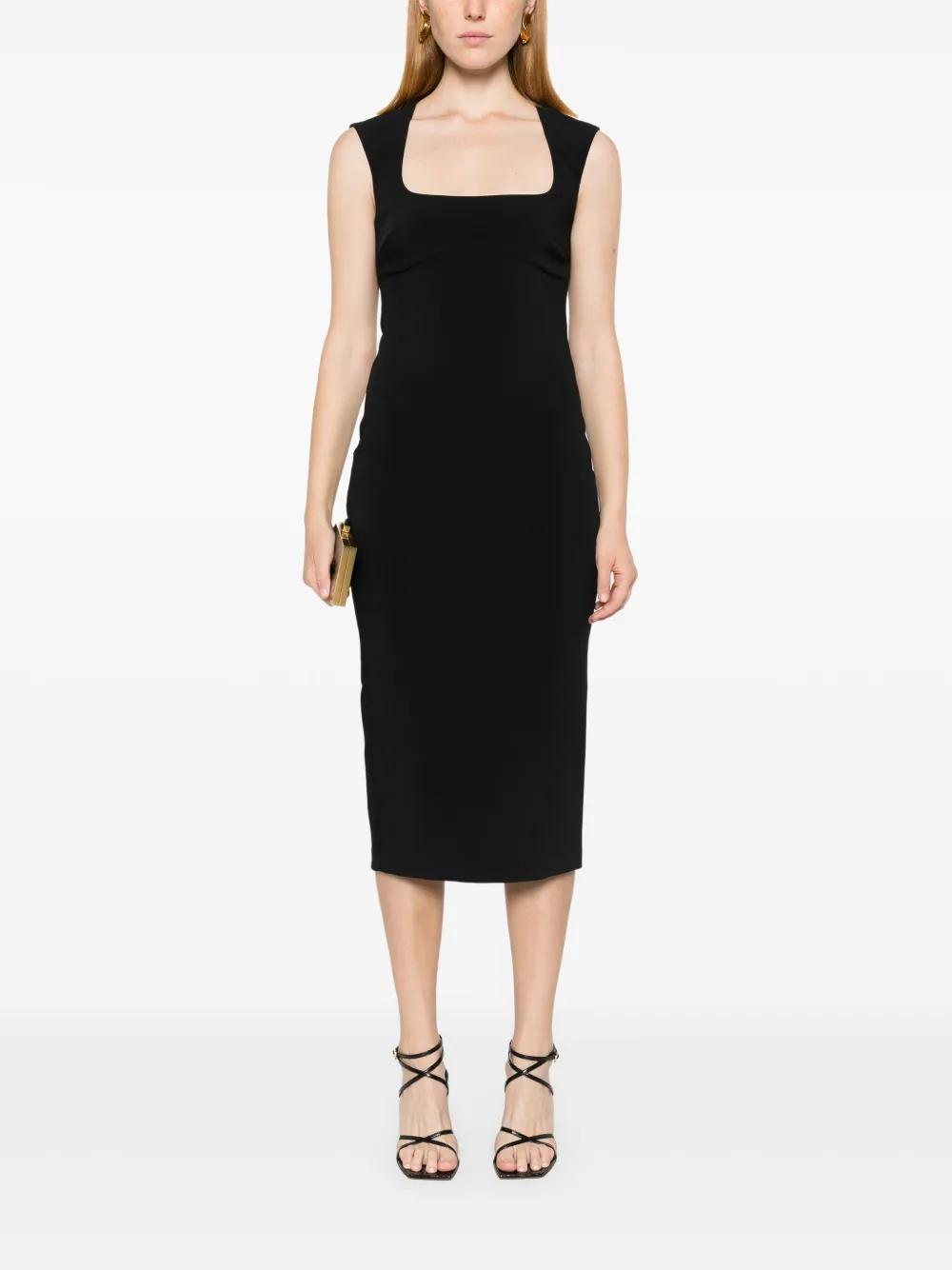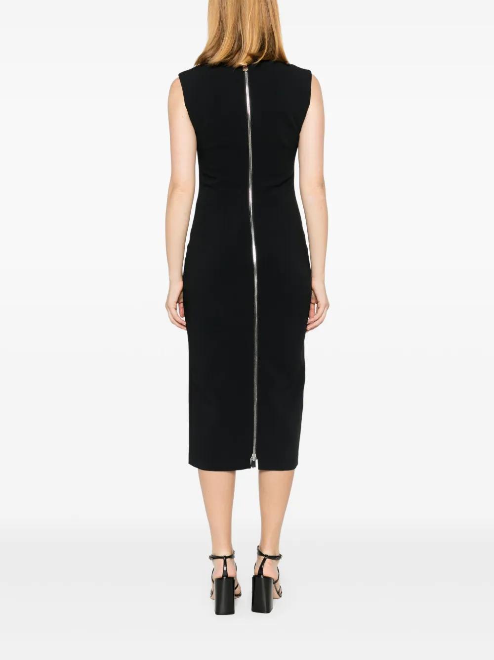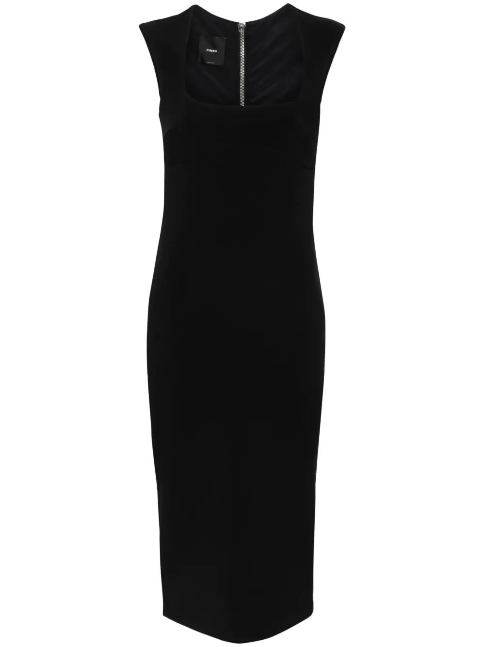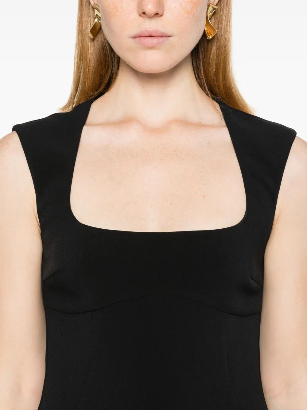 black crepe texture panelled design square neck sleeveless rear zip fastening branded zip puller partial lining straight hem mid-length