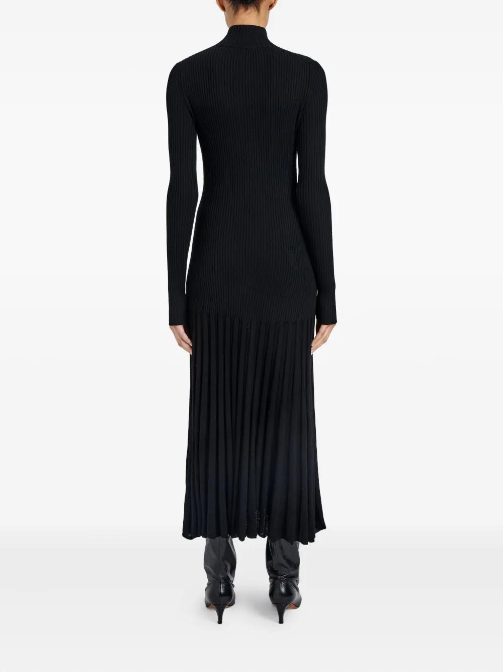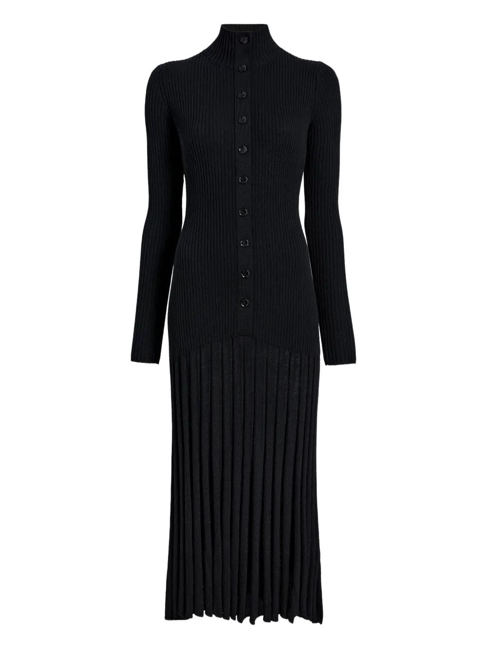 black ribbed knit button placket turtleneck long sleeves pleated skirt