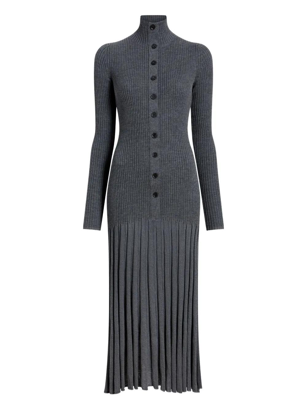 grey ribbed knit button placket turtleneck long sleeves pleated skirt
