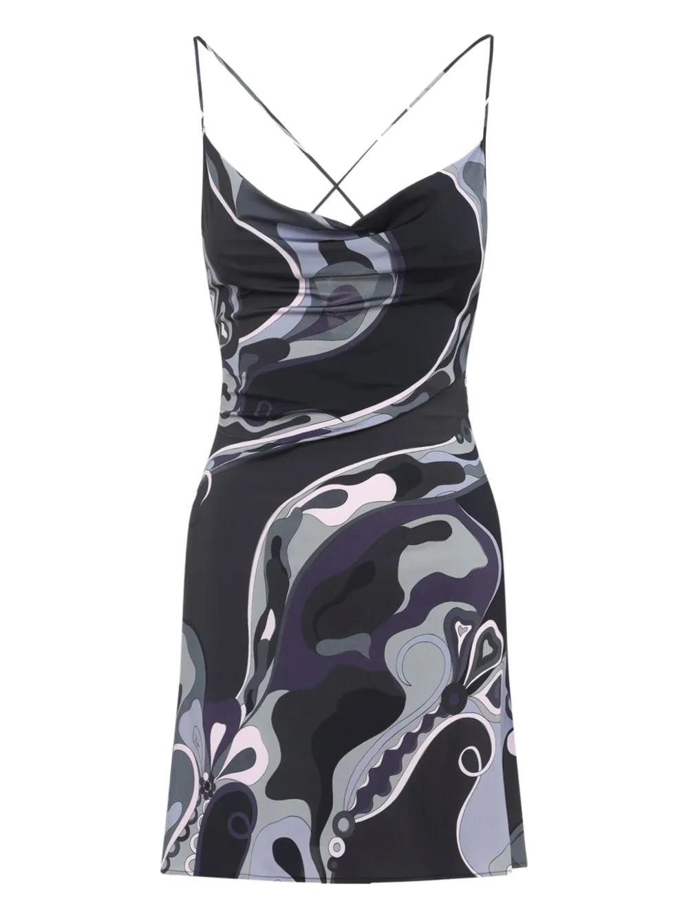 black abstract print cowl neck spaghetti straps criss-cross back straps