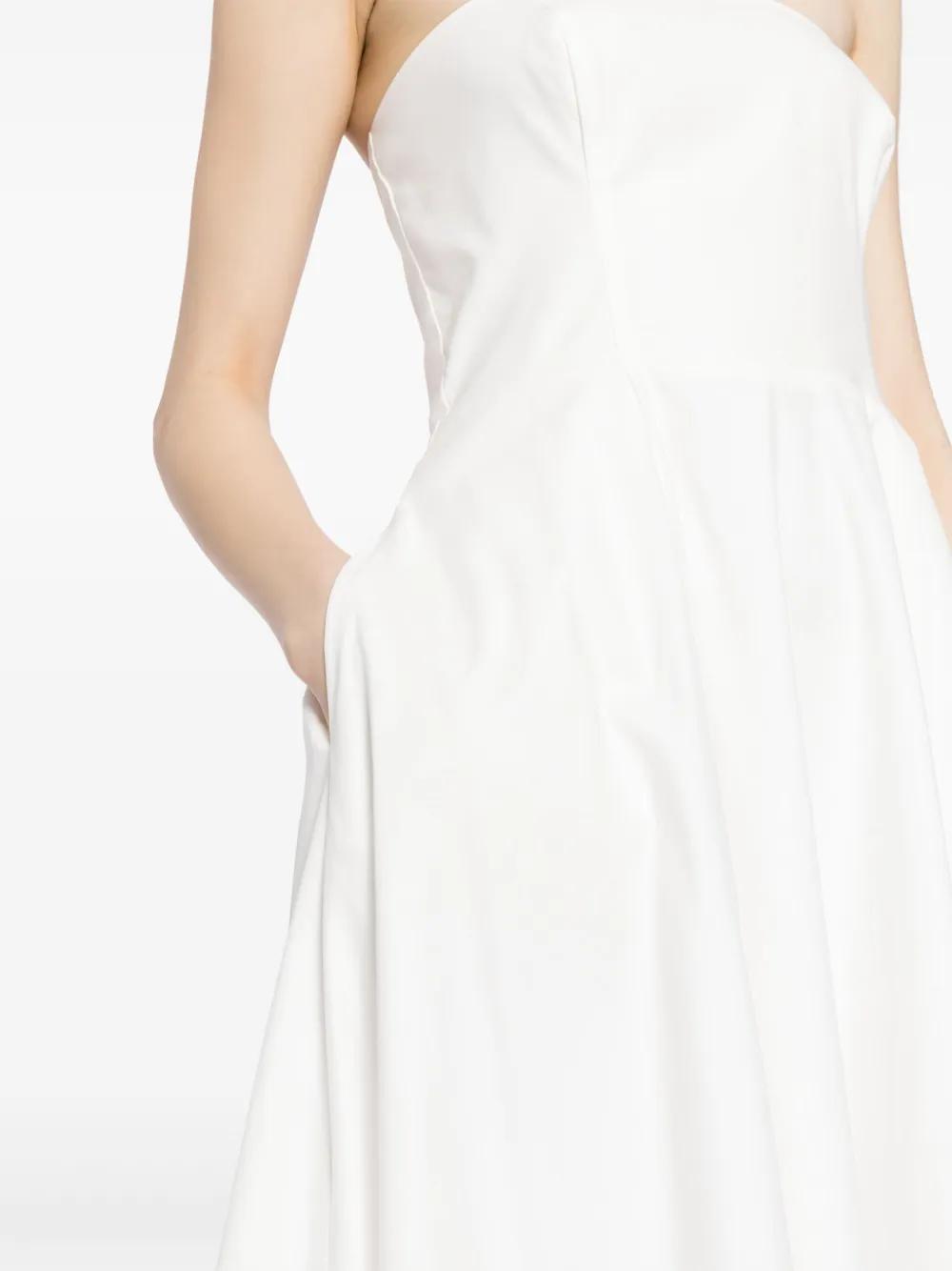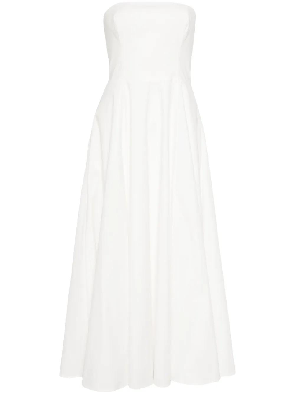 white stretch organic cotton square neck smocked panel concealed rear zip fastening strapless tulle lining mid-length straight hem