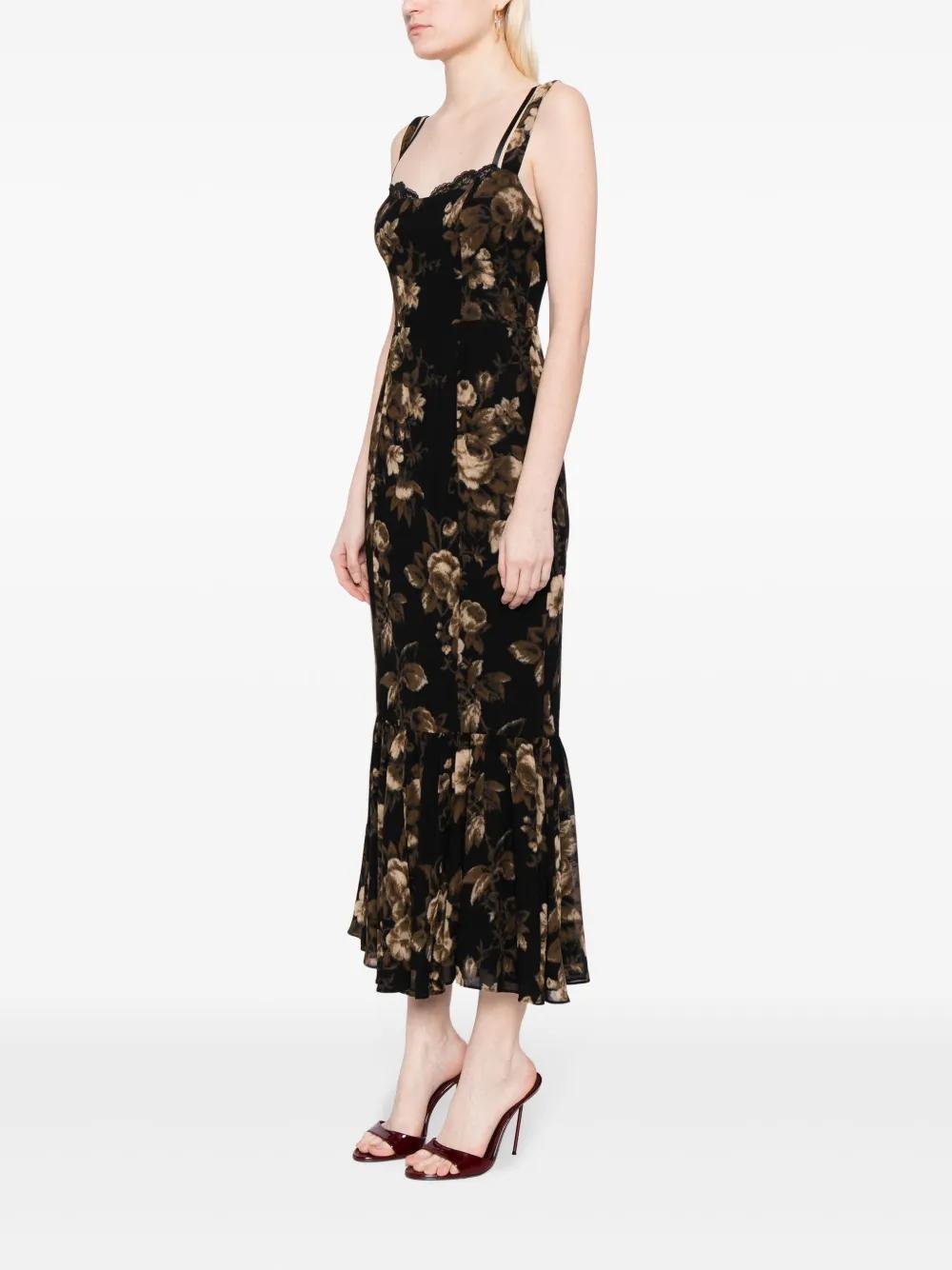 black all-over floral print lace detailing adjustable shoulder straps square neck concealed rear zip fastening ruffle hem mid-length