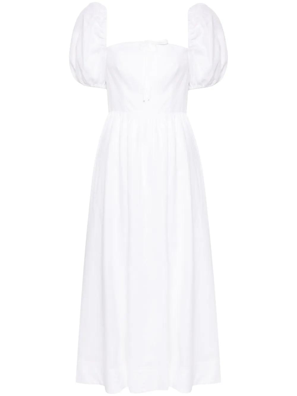 white linen/flax lace trim bow detailing smocked panel square neck short puff sleeves A-line skirt straight hem organic-cotton lining mid-length