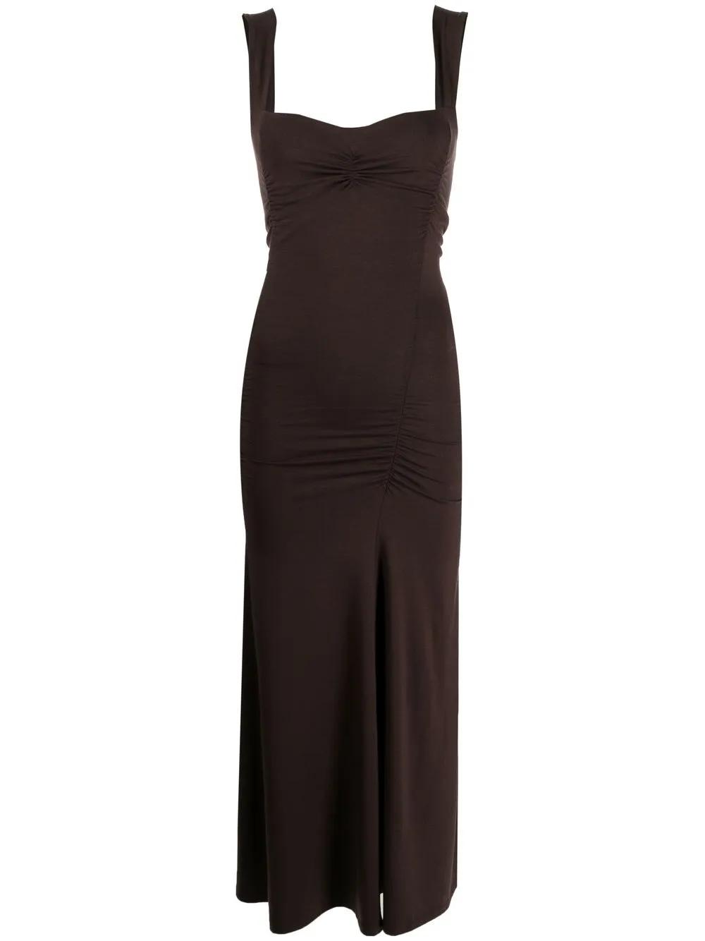 chocolate brown stretch-design ruched detailing sweetheart neck sleeveless mid-length