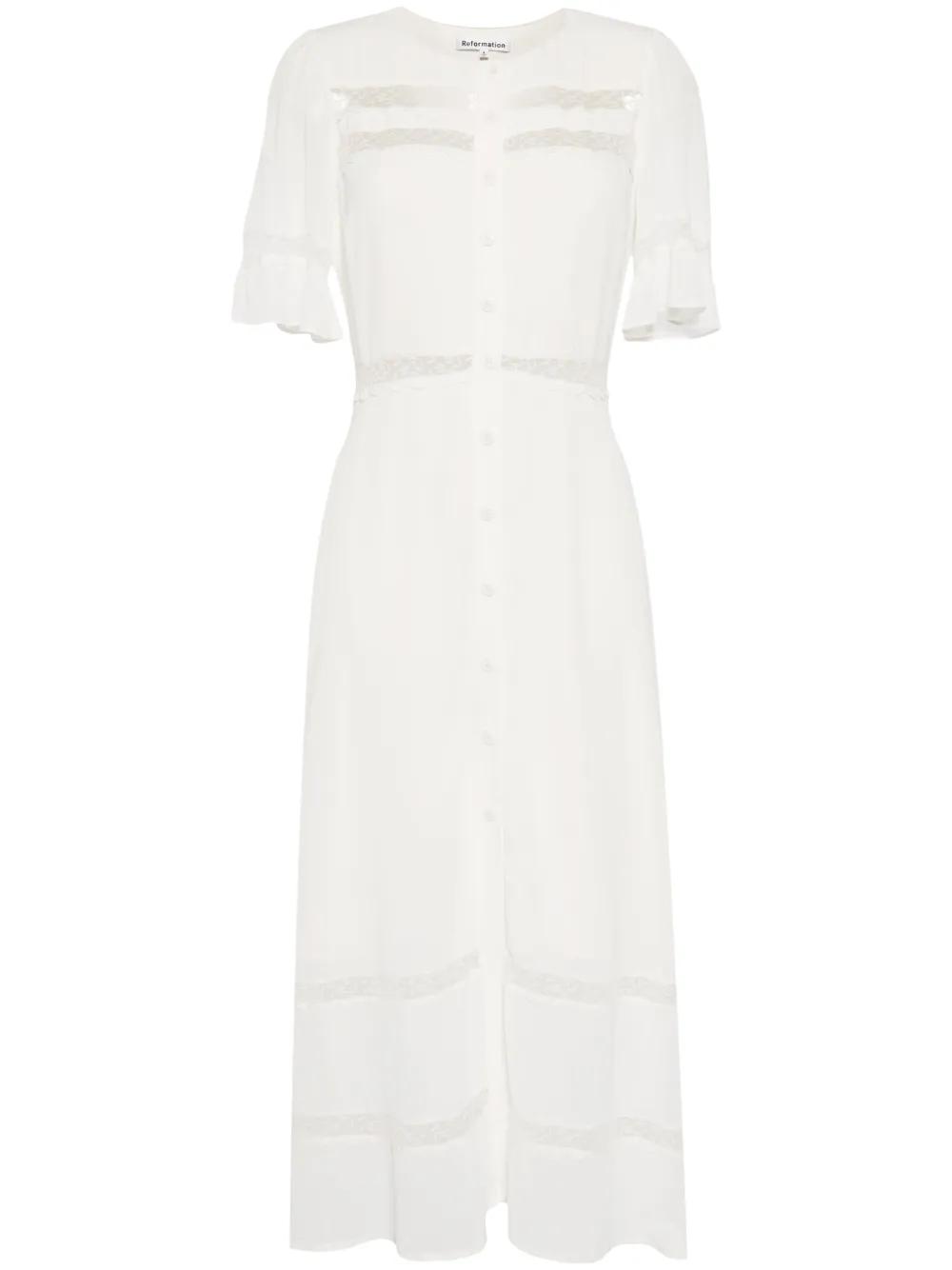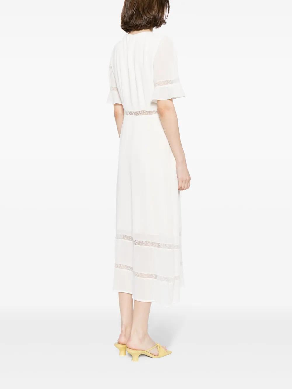 ivory white georgette lace trim round neck front button fastening short sleeves mid-length straight hem