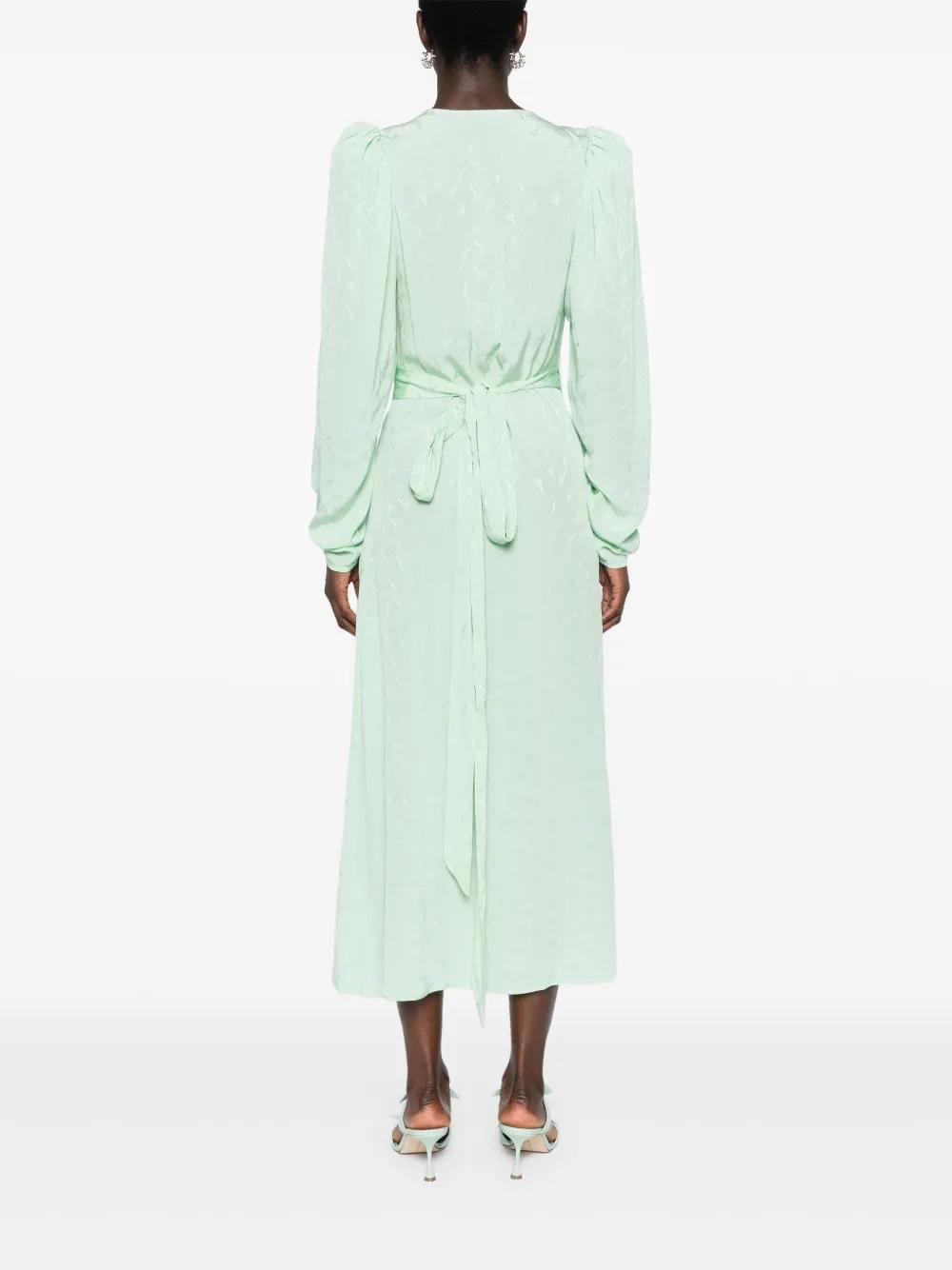 light green patterned jacquard wrap design plunging V-neck long puff sleeves straight hem mid-length self-tie fastening