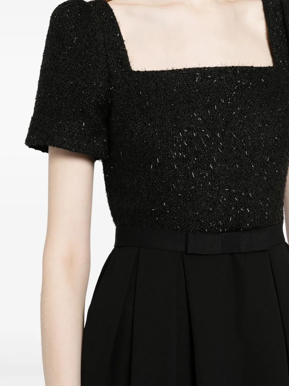 black bouclé construction crepe texture square neck concealed rear zip fastening short sleeves flared skirt mid-length straight hem