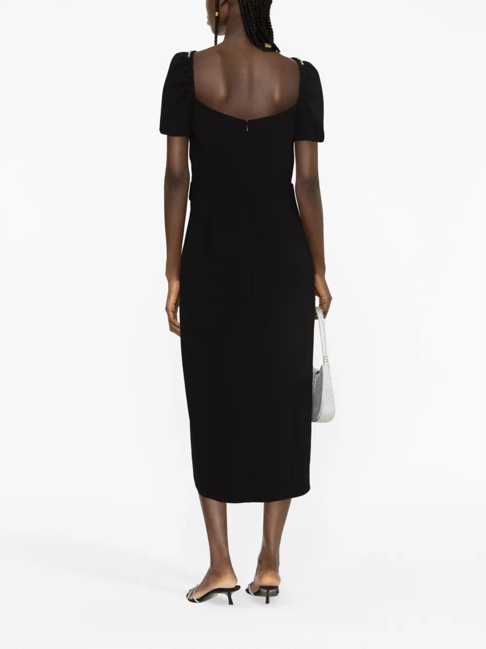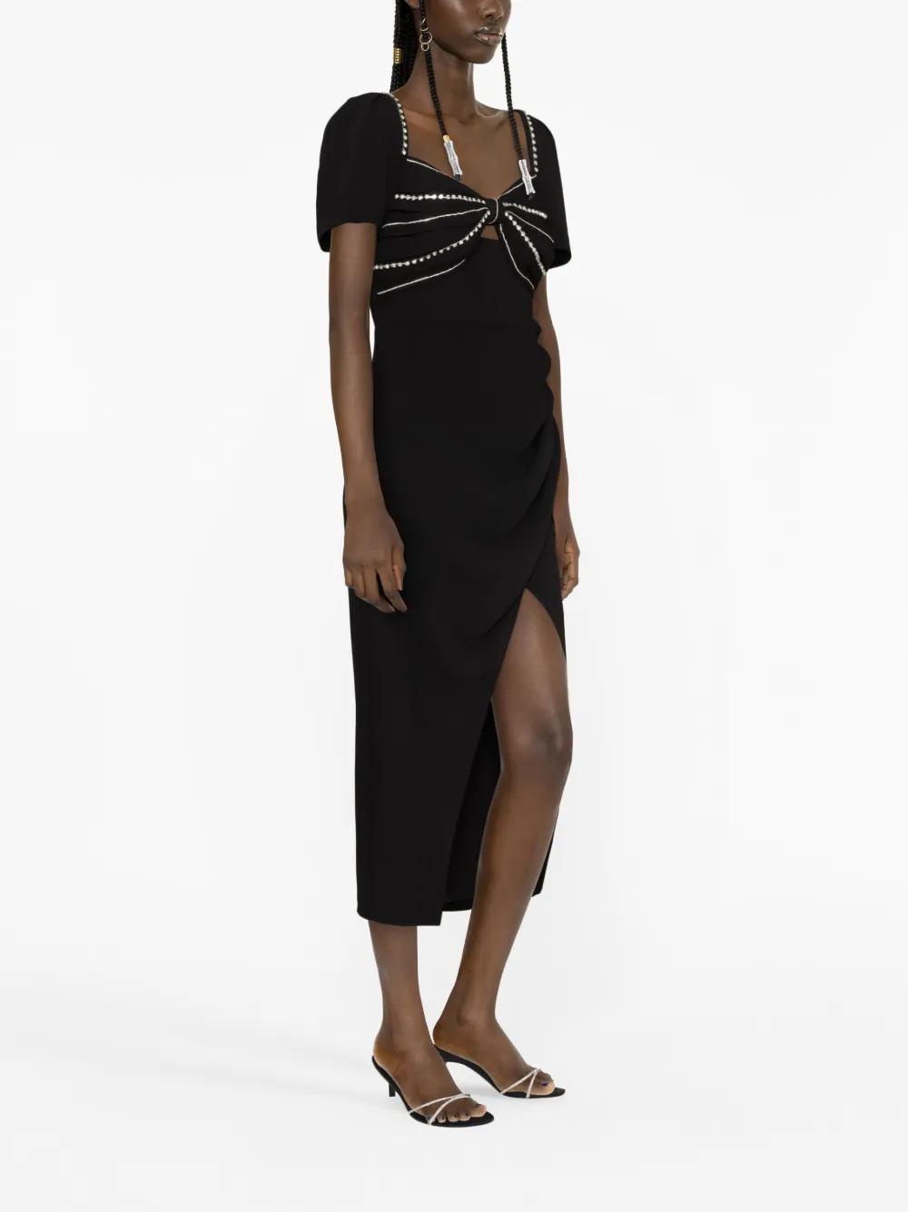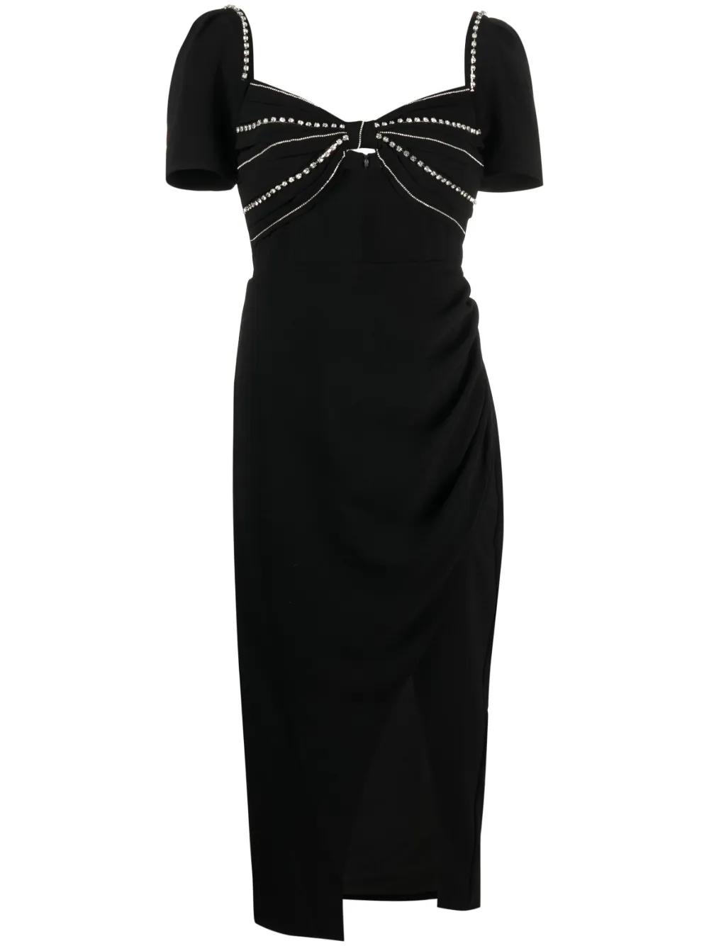 black crystal embellishment cut-out detailing sweetheart neck concealed rear zip fastening short puff sleeves ruched detailing front slit mid-length