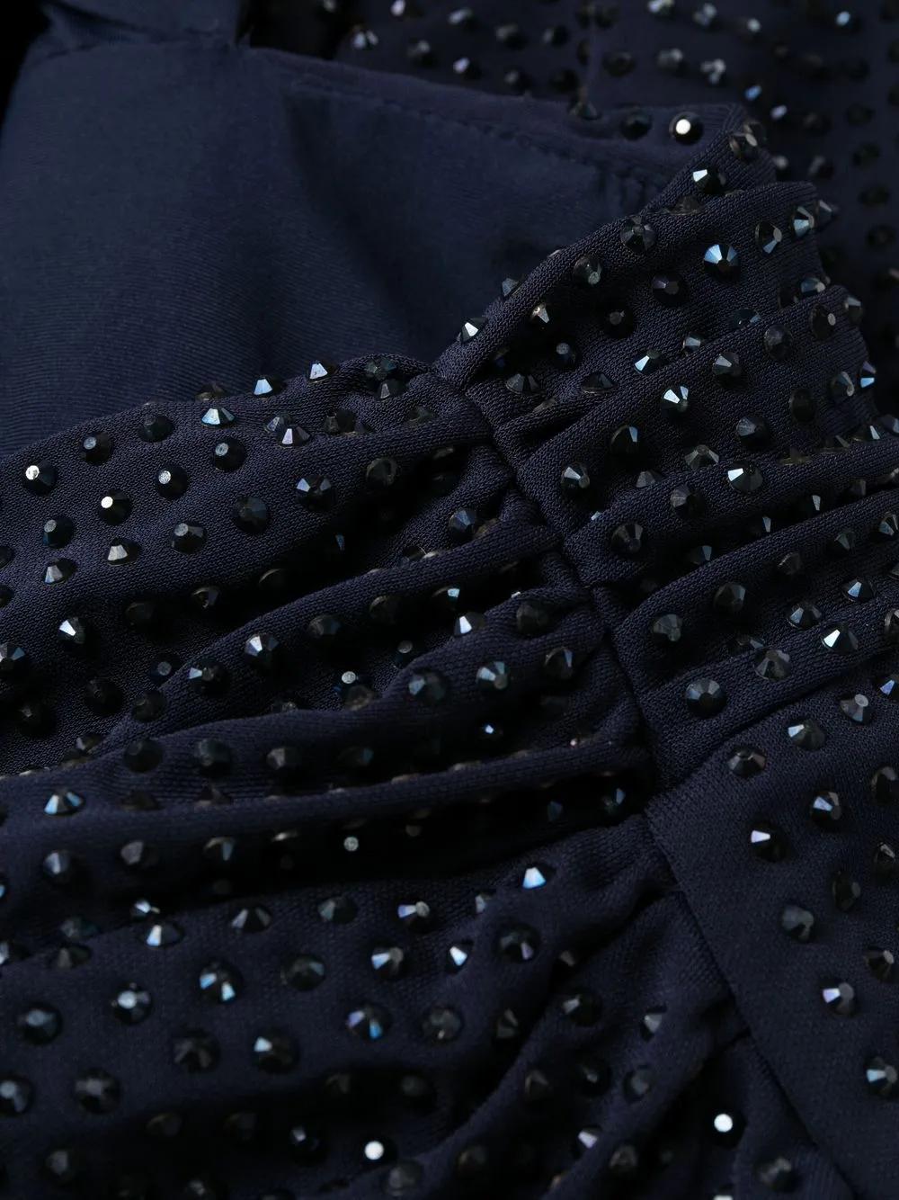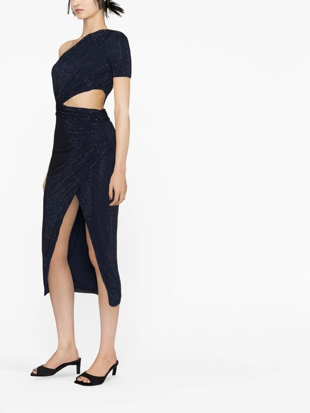 navy blue off-shoulder asymmetric neck short sleeves cut-out detailing front slit mid-length