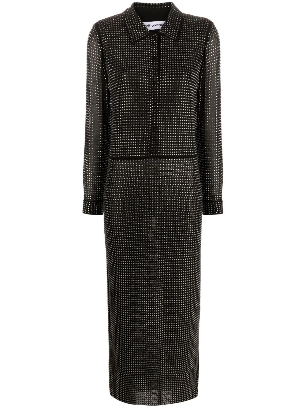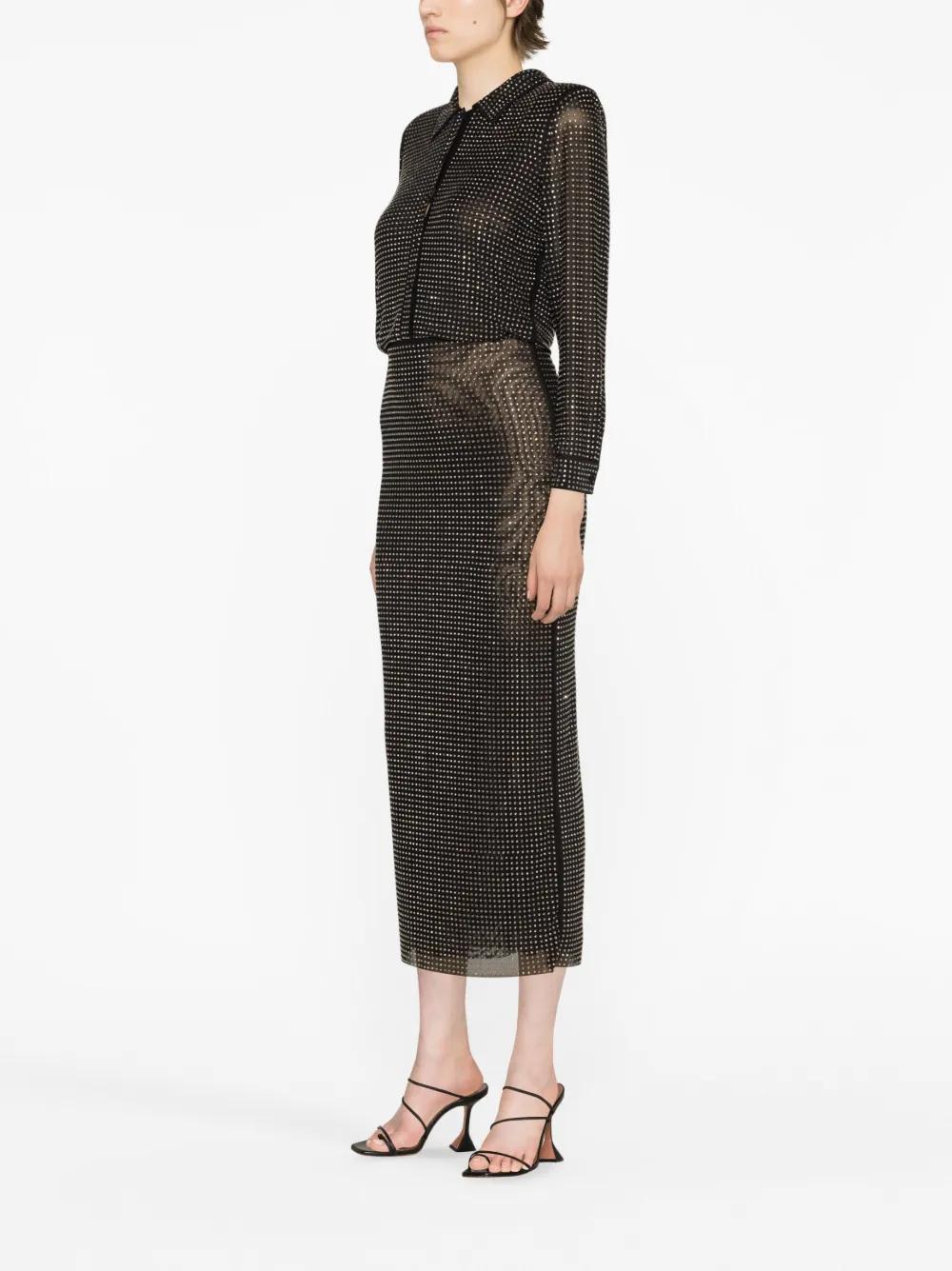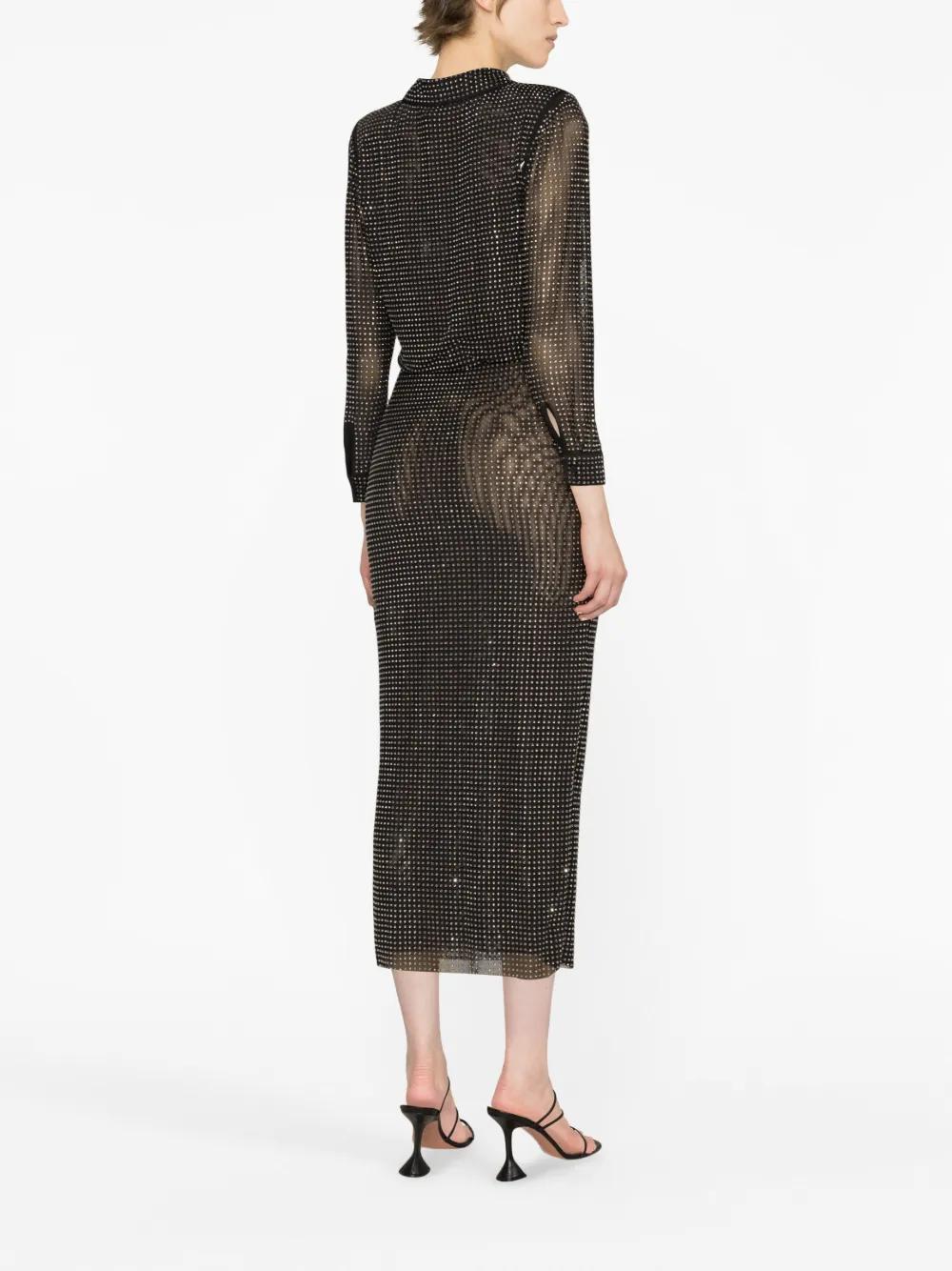 black stretch-design mesh detailing rhinestone embellishment spread collar V-neck front button fastening long sleeves mid-length