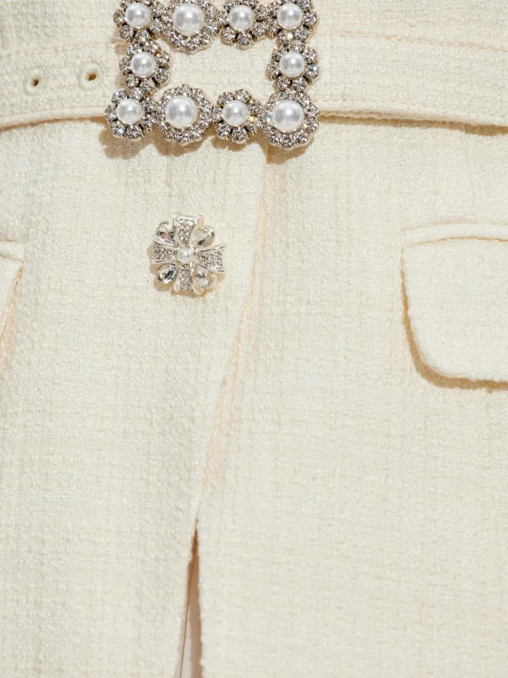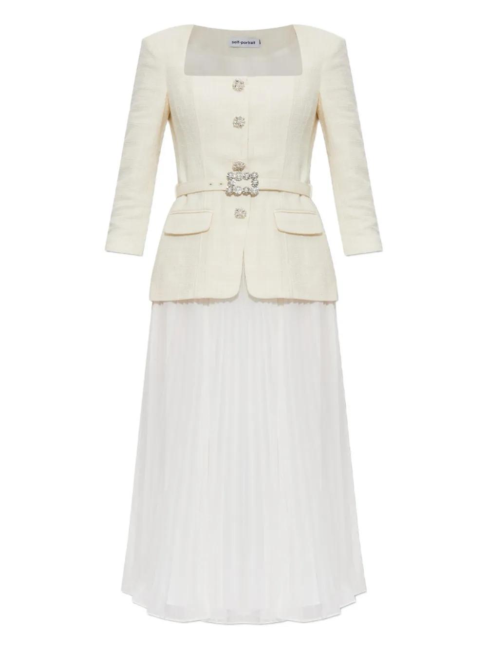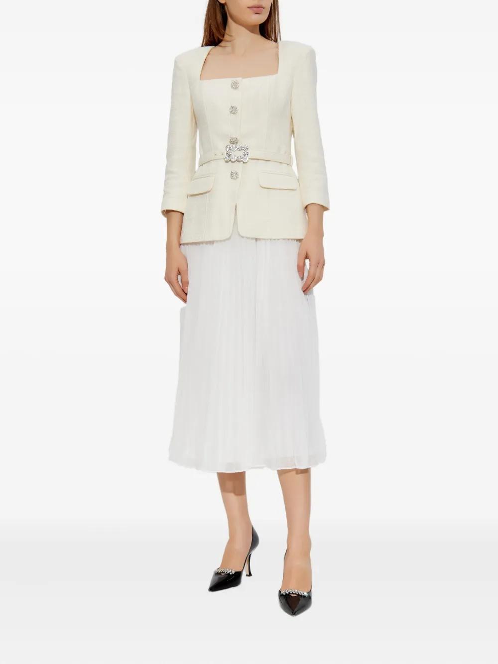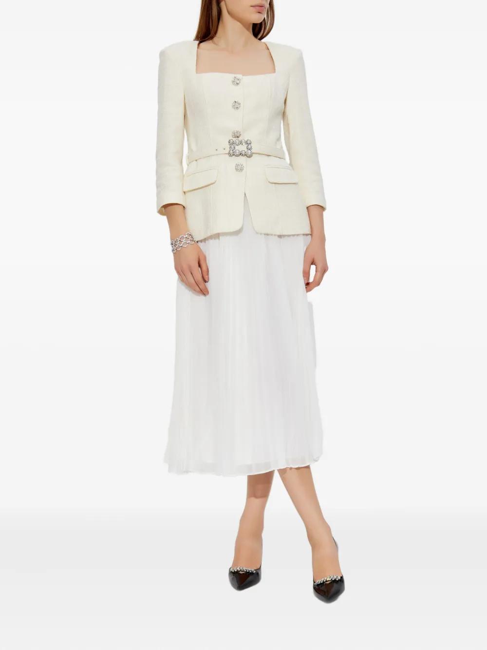 white-cream crystal-embellished belt pleated skirt button fastening three-quarter sleeves square neck