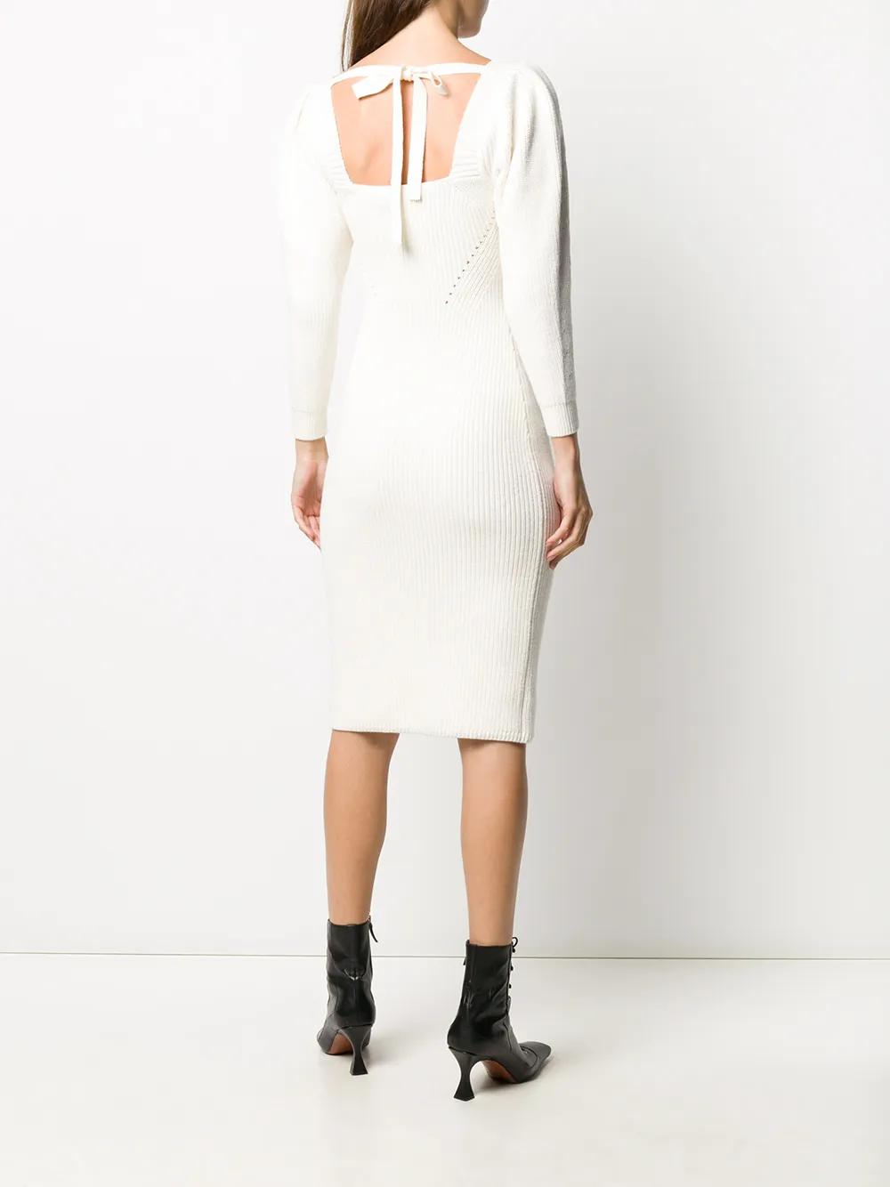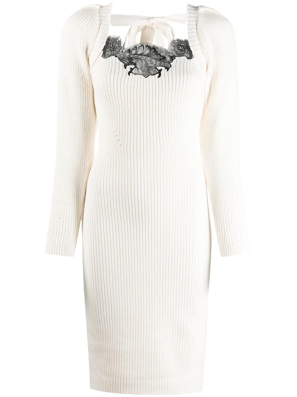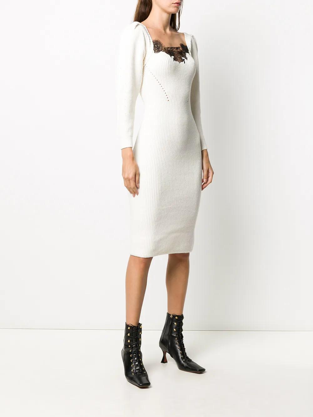 ivory cotton-wool blend ribbed knit lace trim sweetheart neck gigot sleeves rear tie fastening