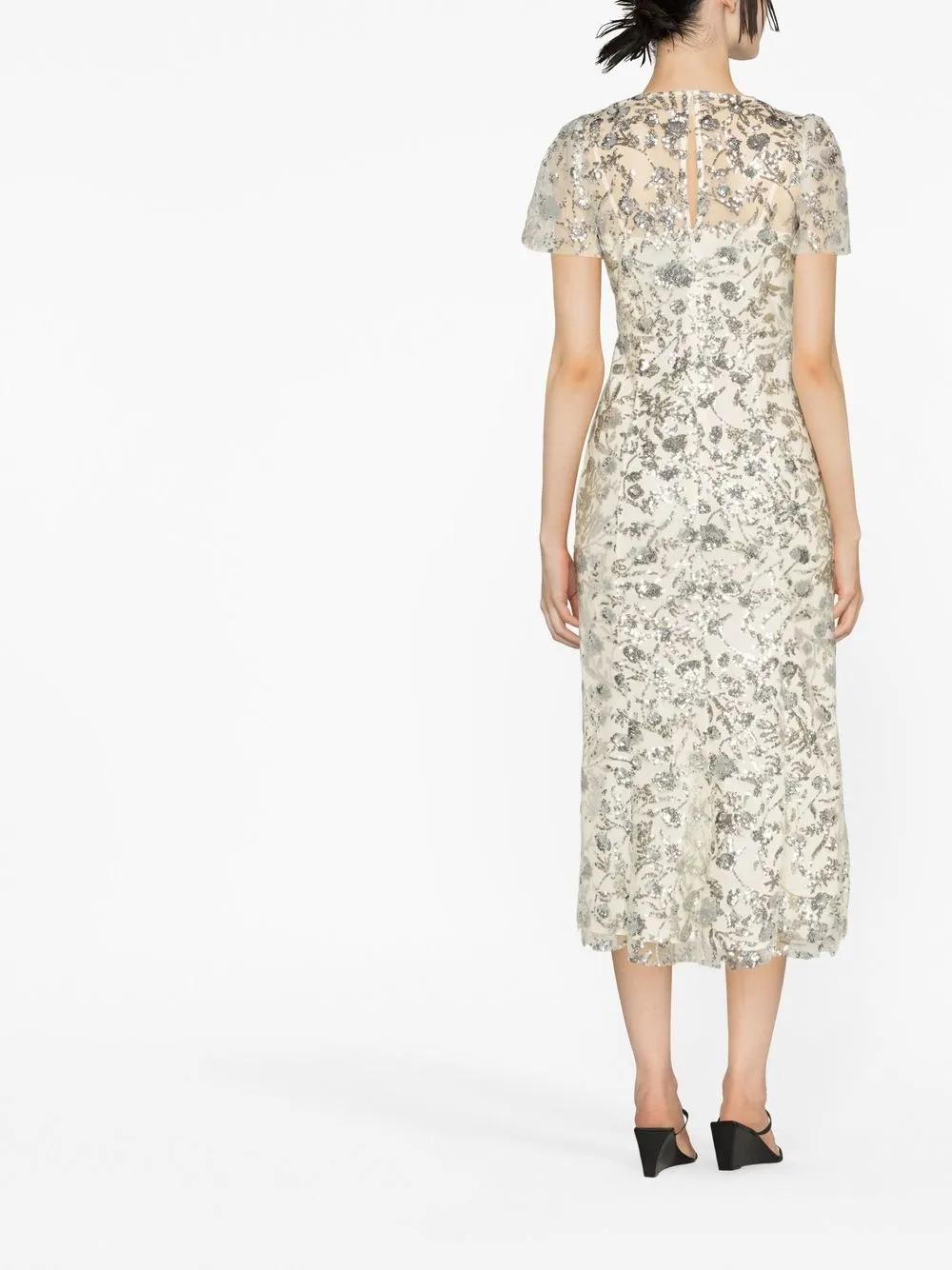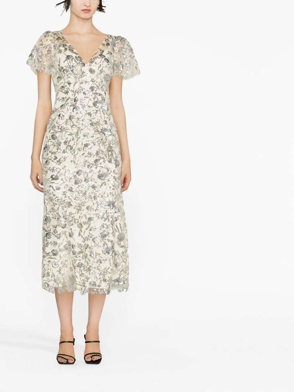 champagne silver-tone tulle netting sequin detailing V-neck short sleeves mid-length