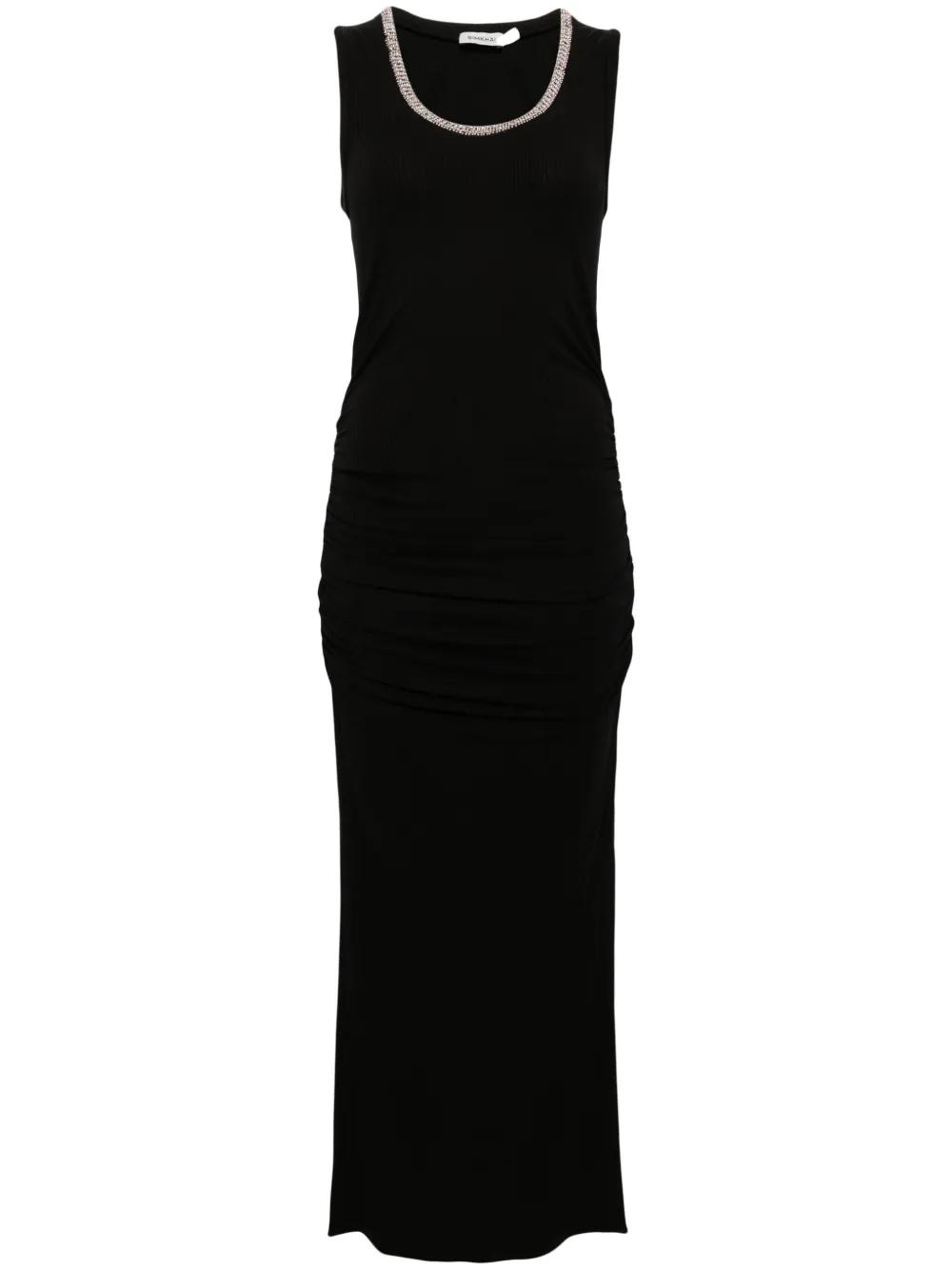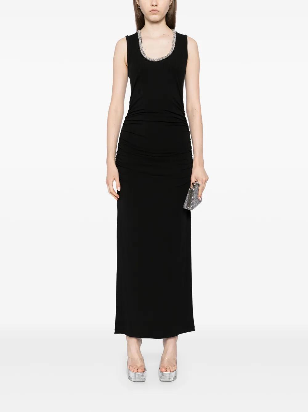 black fine ribbed scoop neck bead embellishment sleeveless ruched detailing draped detailing side slits