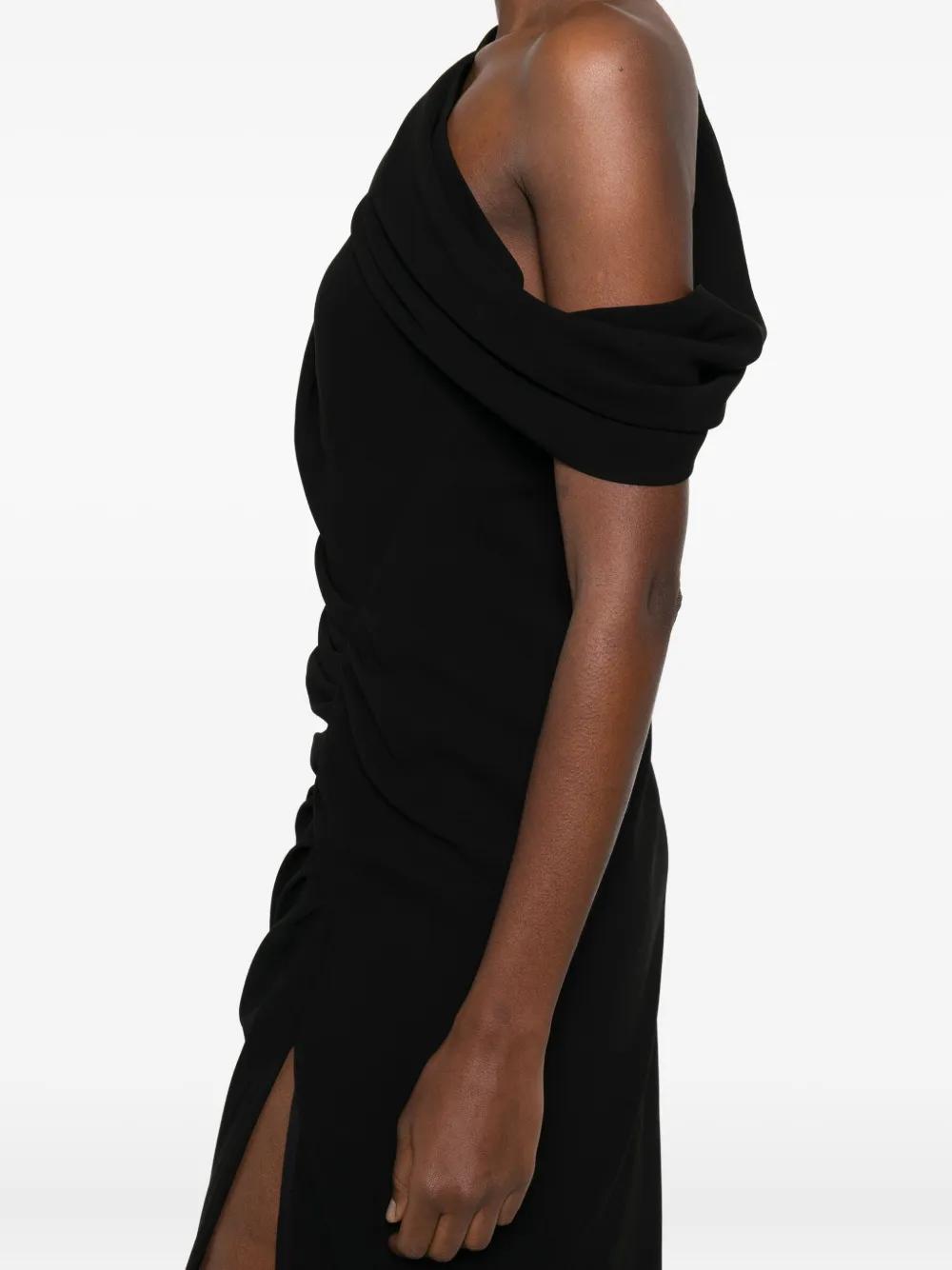 black one-shoulder design draped detail side slit asymmetric neckline