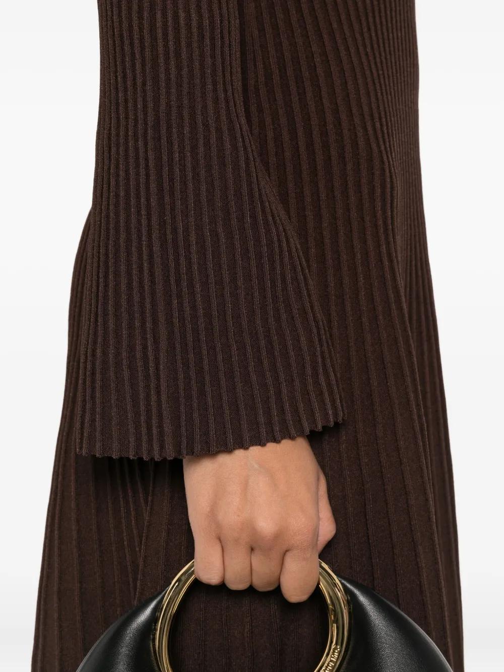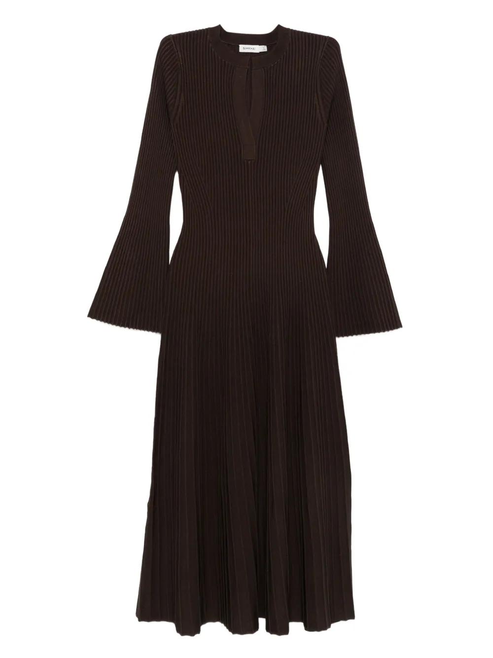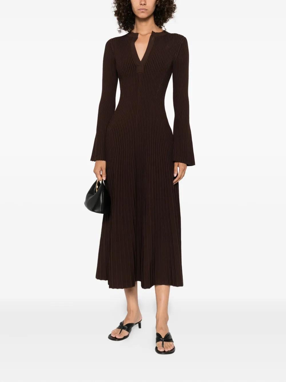 brown ribbed knit bell sleeves V-neckline A-line skirt fitted bodice