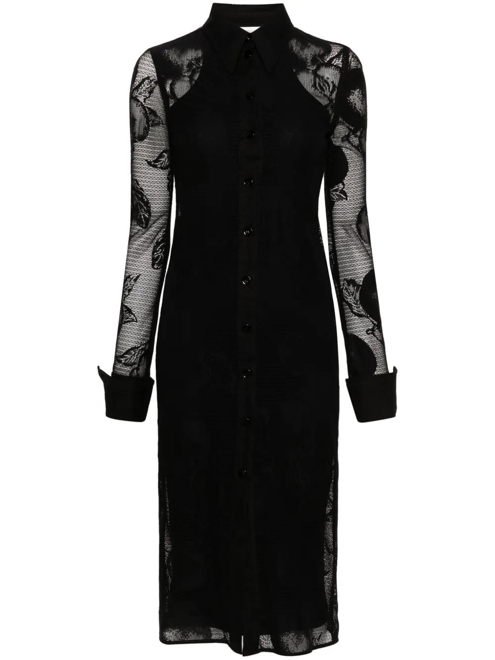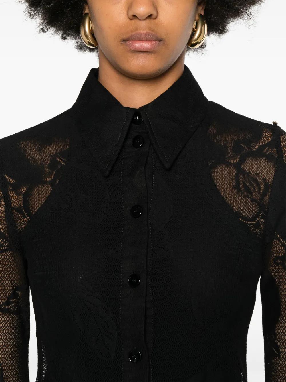 black cotton blend floral-lace design semi-sheer construction classic collar long sleeves with buttoned cuffs signature rhinestone embellishment to the shoulder mid-length straight hem detachable slip dress front button fastening