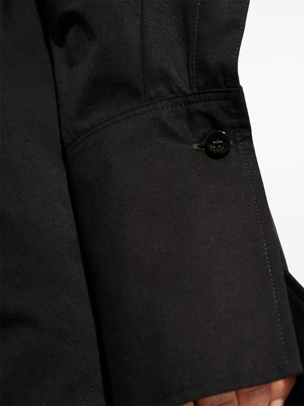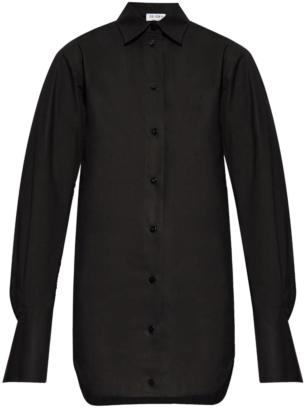 black cotton raised logo detail straight-point collar front button fastening long sleeves buttoned cuffs curved hem