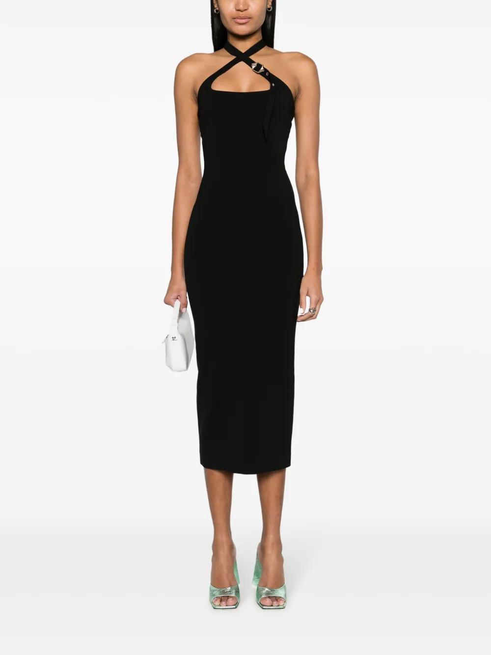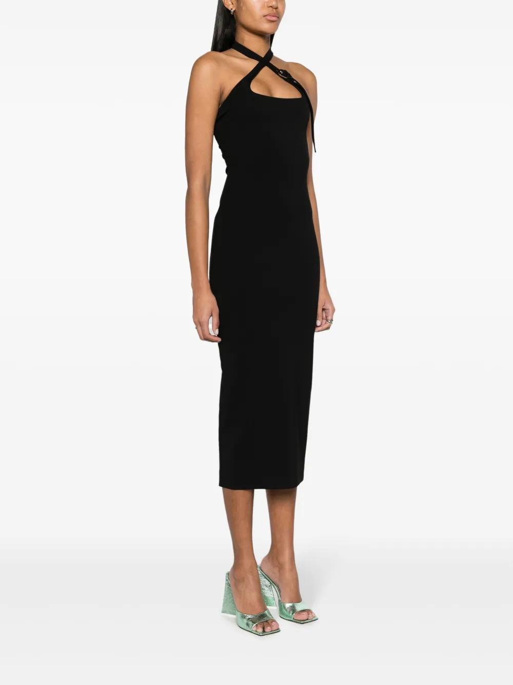 black stretch-jersey crossover halterneck logo-buckle fastening concealed rear zip fastening central rear vent mid-calf length straight hem