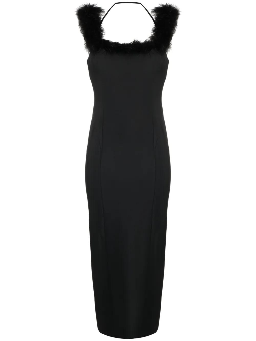 black stretch-design feather-trim detailing halterneck sleeveless rear slit calf-length