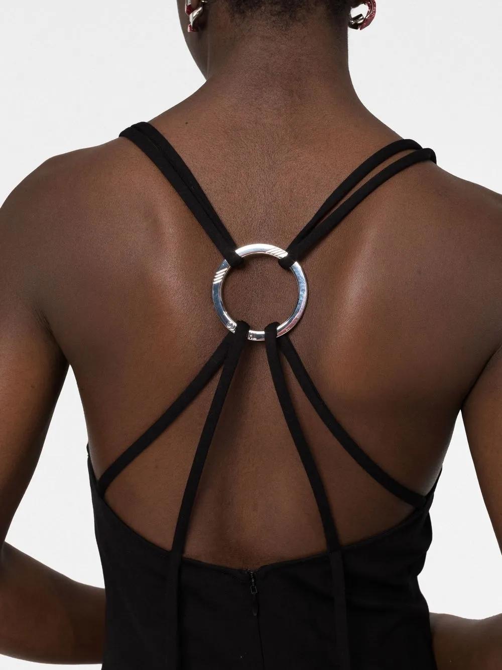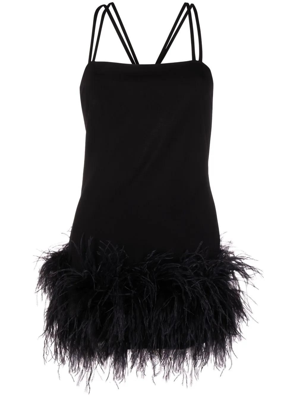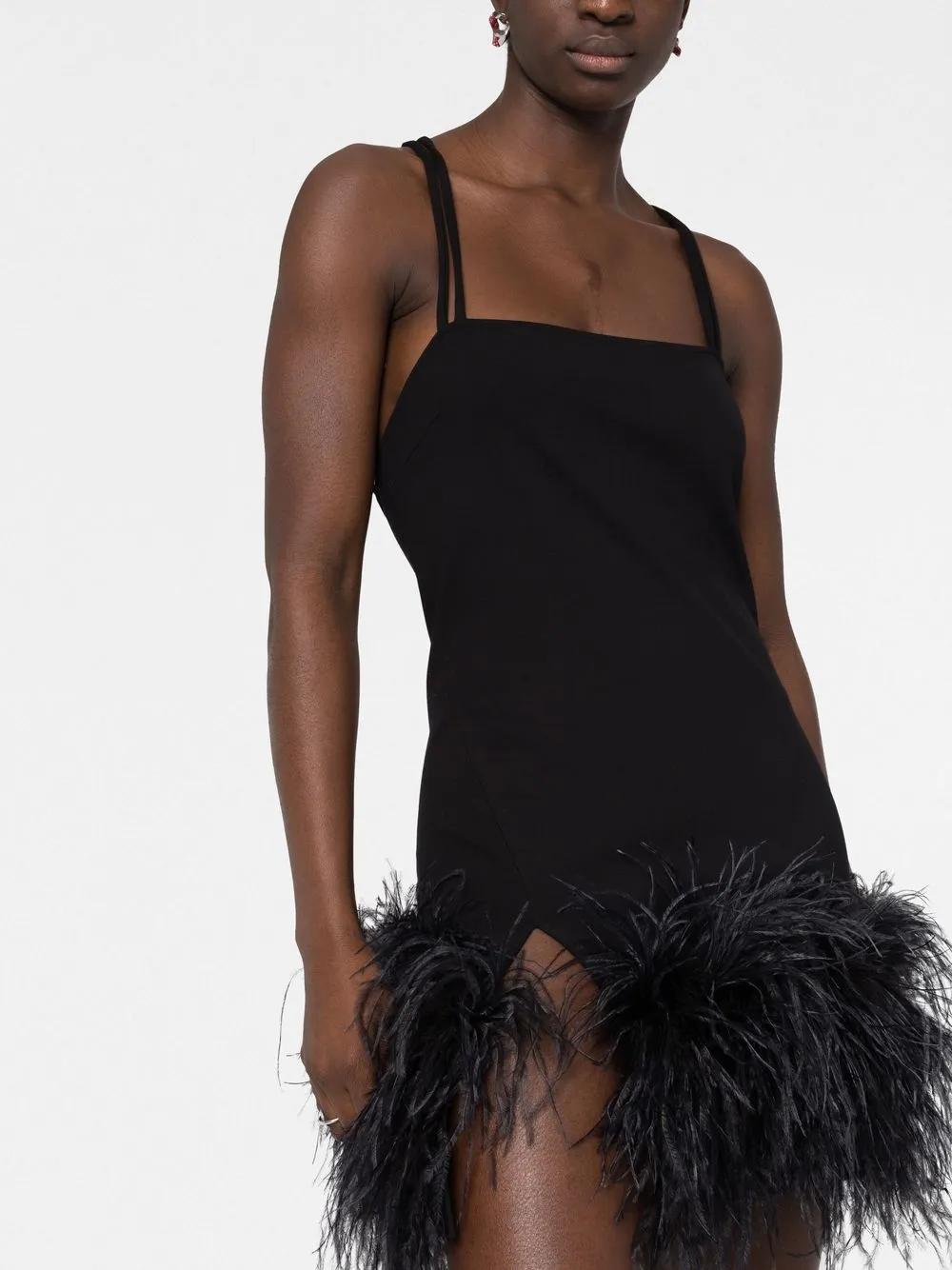 jet black ostrich feather silver-tone hardware spaghetti straps square neck scoop back rear zip fastening straight hem