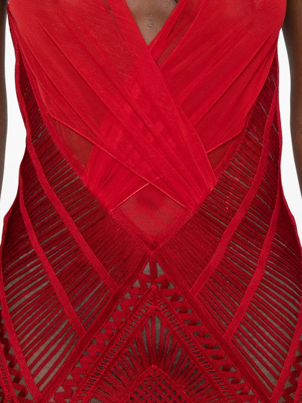 red geometric pattern fringe trim sleeveless V-neck sheer panel