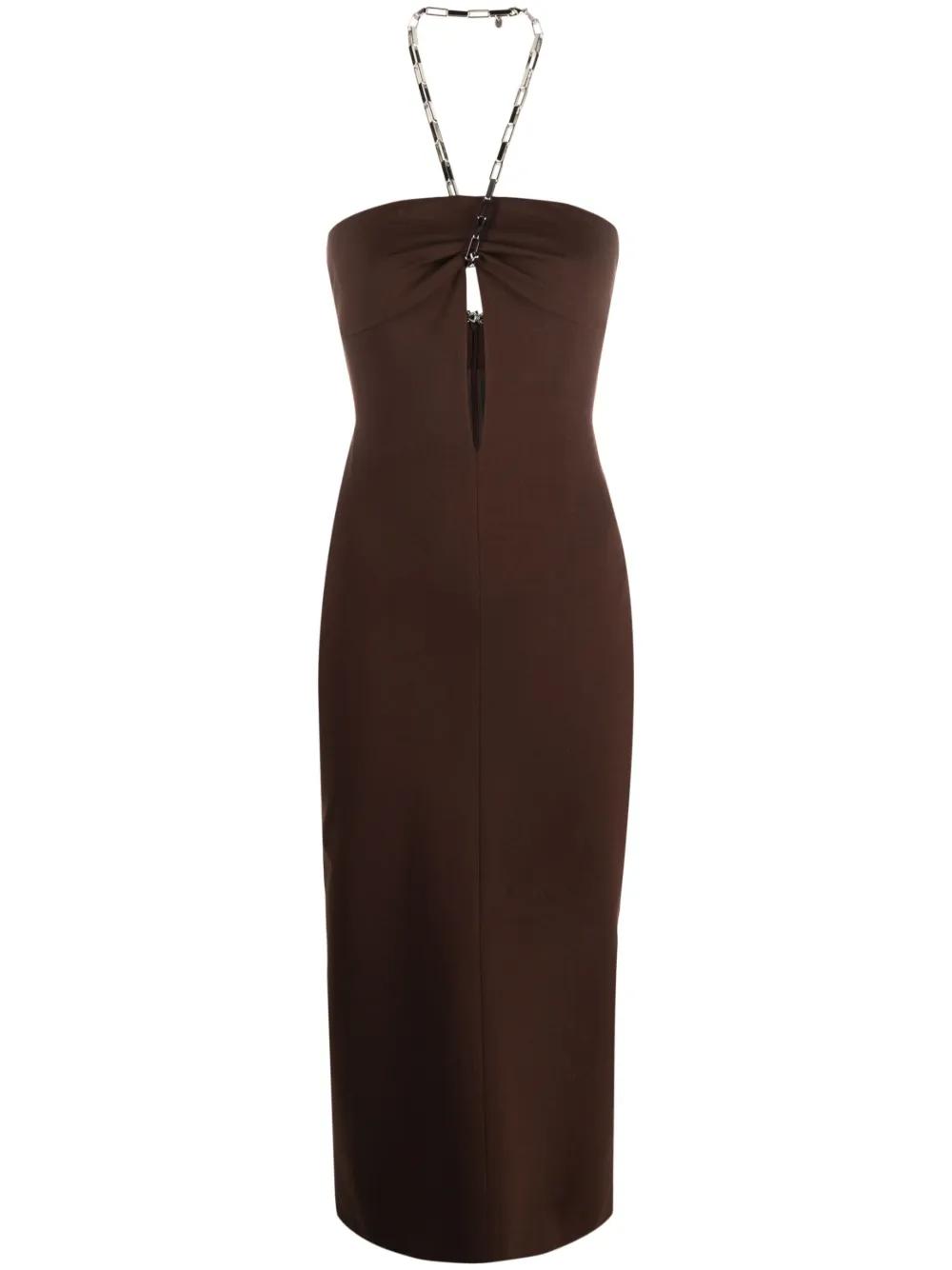 chocolate brown stretch-design halterneck cut-out detailing chain-link detailing mid-length straight hem
