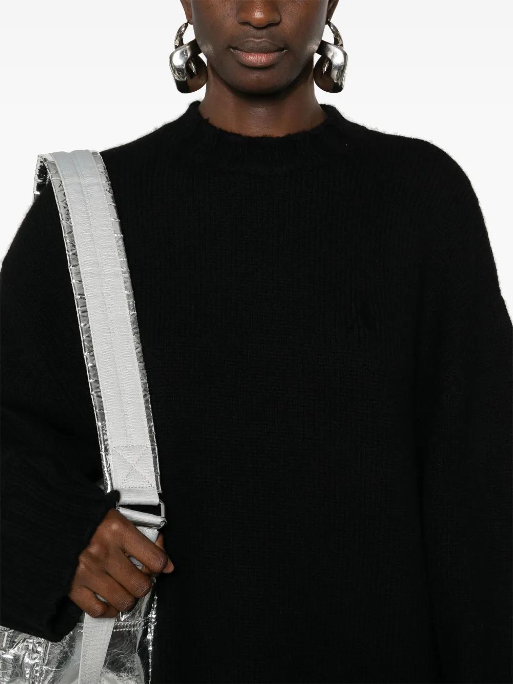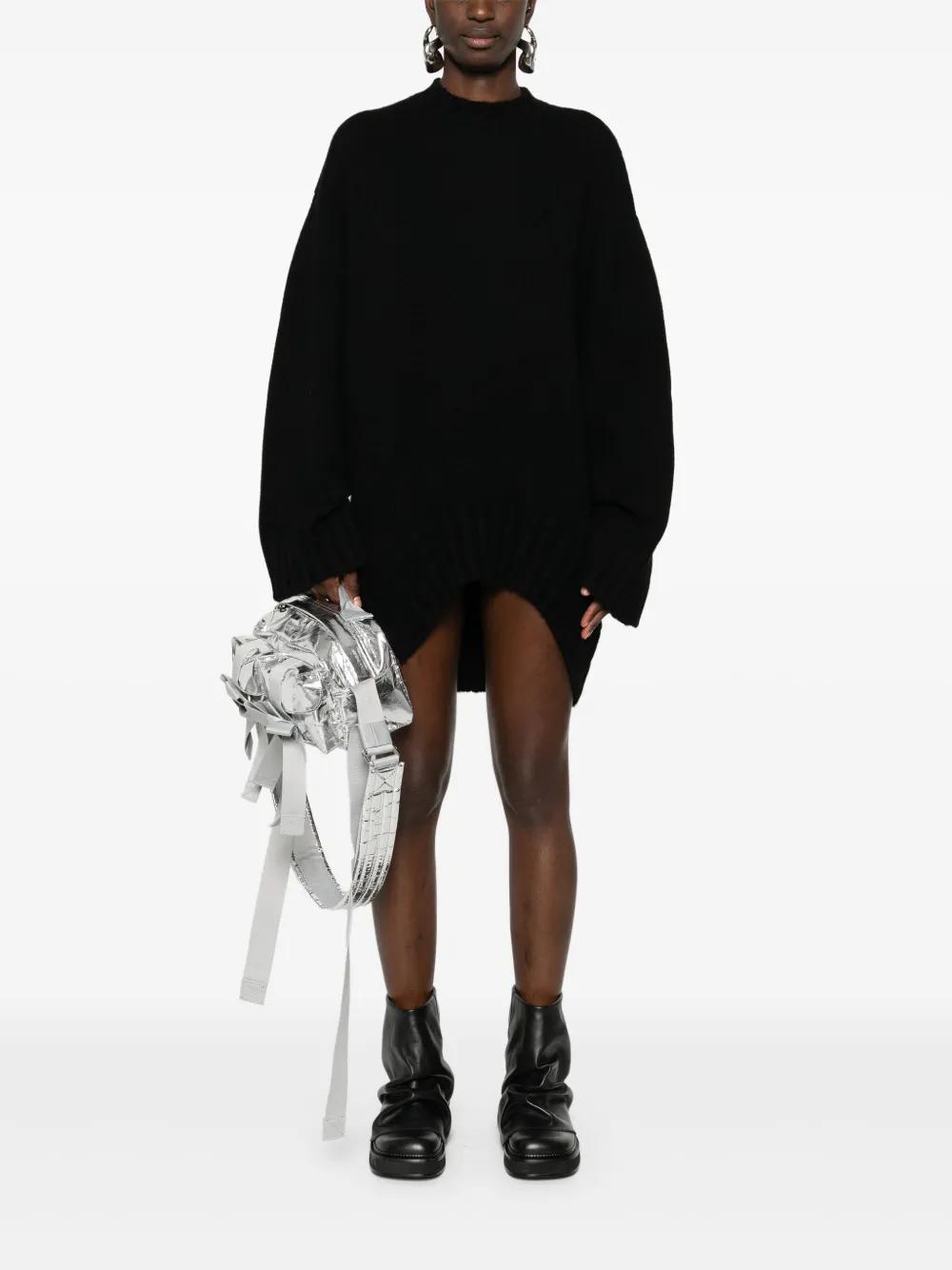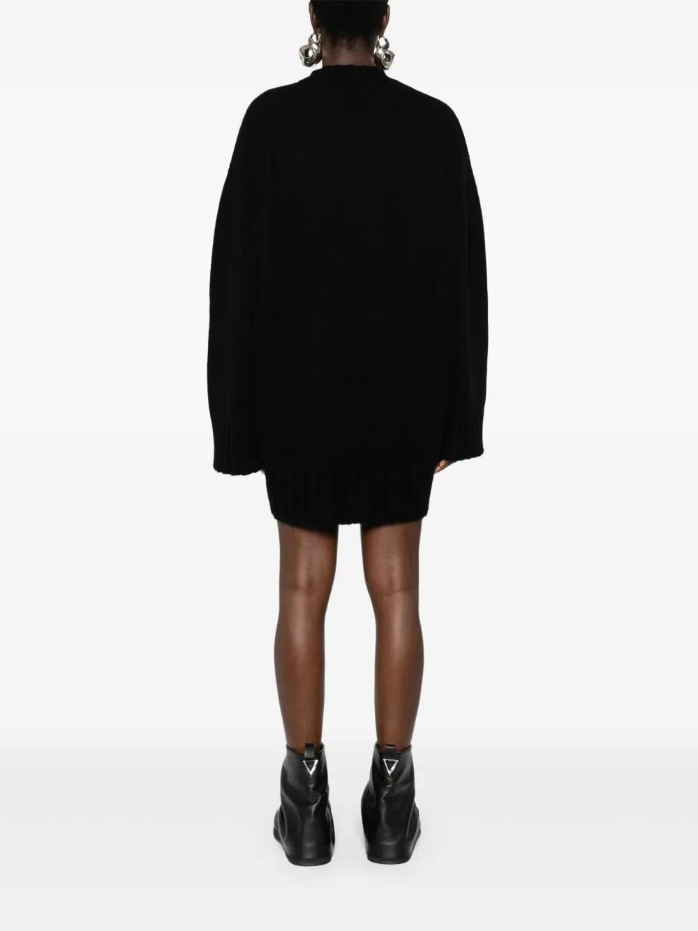 black wool-cashmere blend ribbed knit mock neck drop shoulder long sleeves ribbed cuffs and hem curved hem above-knee length