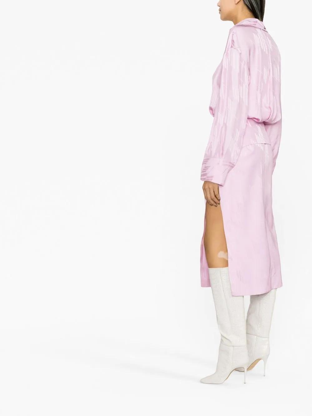 pink satin finish jacquard logo motif classic collar front button fastening long sleeves buttoned cuffs side slit mid-length