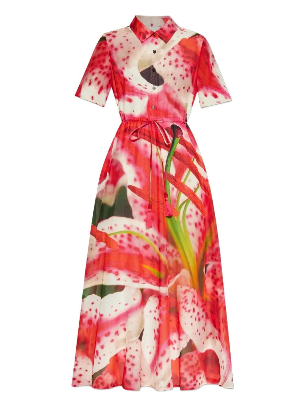 fuchsia pink front button fastening short sleeves elasticated drawstring waistband tassel detail