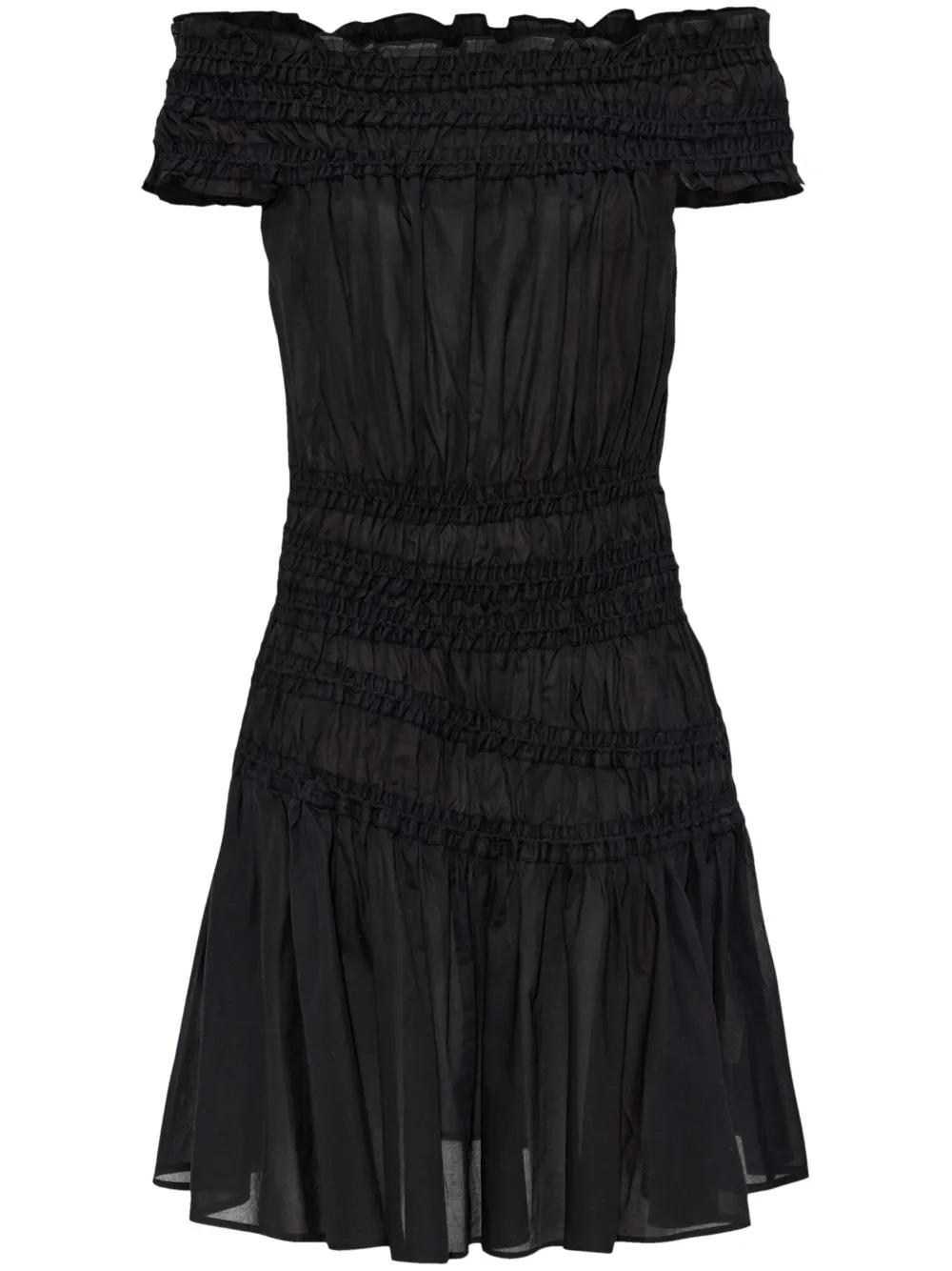 black cotton semi-sheer construction ruffled detailing gathered detailing pull-on style short sleeves flared hem mid-length